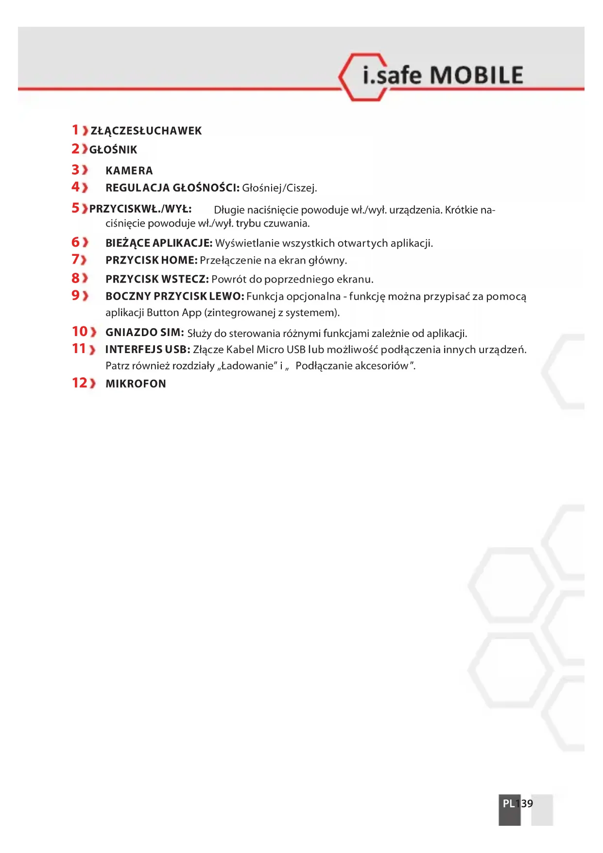 Po pierwszym włączeniu urządzenia, postępować zgodnie zinstrukcjami na ekranie. Dodatkowe informacje na temat obsługi urządzenia można znaleźć na stronie www.isafe-mobile.com/en/support/service wpozycji „FAQ”. Szczegółowe informacje dotyczące obsługi systemu operacyjnego Android można znaleźć na stronie: https://support.google.com/android UWAGA Mikrofon znajduje się w dolnej części urządzenia. Aby zapewnić optymalną komunikację, należy upewnić się, że mikrofon nie jest zakryty.PL 145