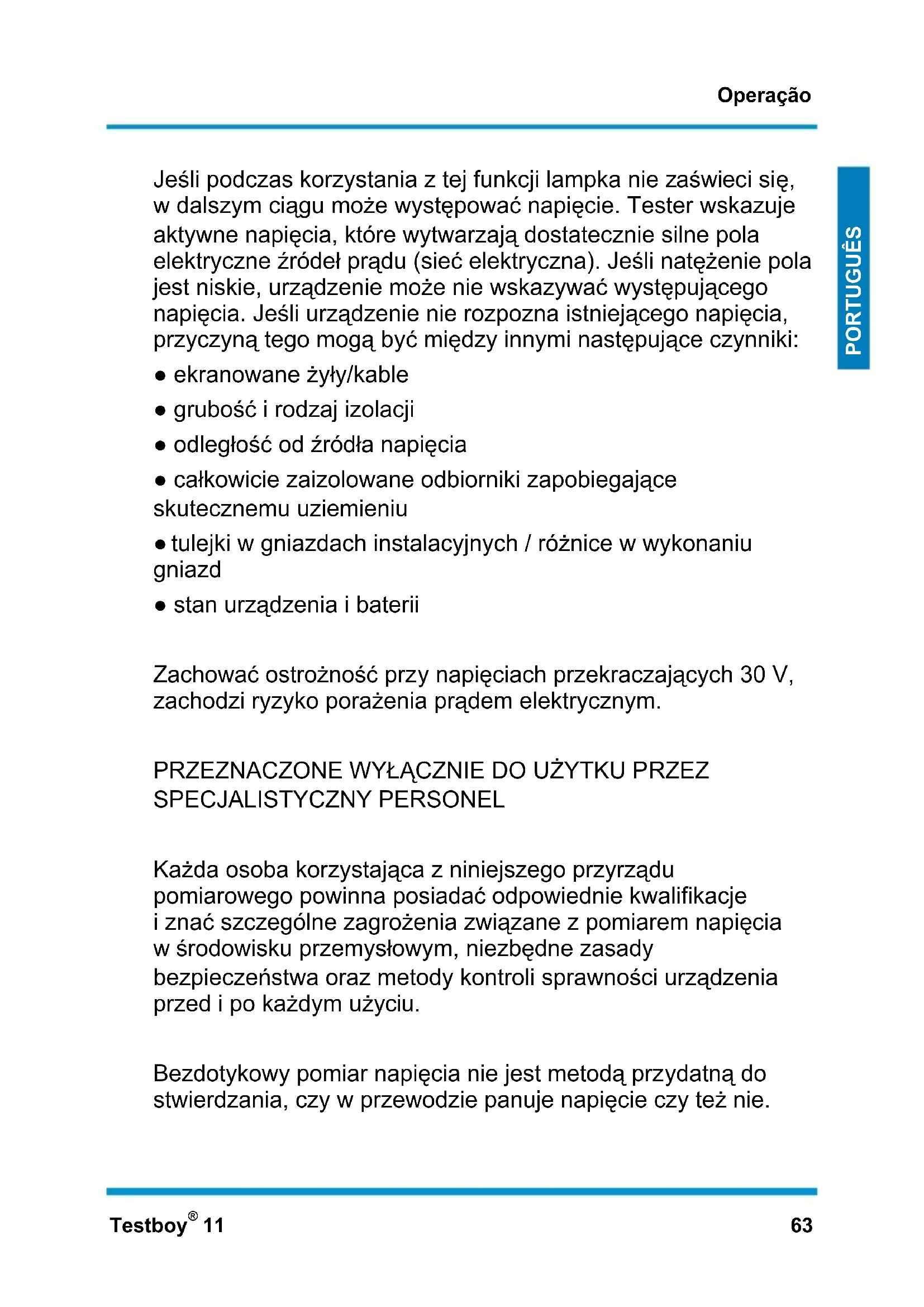 tulejki w gniazdach instalacyjnych / różnice w wykonaniu gniazd ● stan urządzenia i baterii Zachować ostrożność przy napięciach przekraczających 30 V, zachodzi ryzyko porażenia prądem elektrycznym. PRZEZNACZONE WYŁĄCZNIE DO UŻYTKU PRZEZ SPECJALISTYCZNY PERSONEL Każda osoba korzystająca z niniejszego przyrządu pomiarowego powinna posiadać odpowiednie kwalifikacje i znać szczególne zagrożenia związane z pomiarem napięcia w środowisku przemysłowym, niezbędne zasady bezpieczeństwa oraz metody kontroli sprawności urządzenia przed i po każdym użyciu. Bezdotykowy pomiar napięcia nie jest metodą przydatną do stwierdzania, czy w przewodzie panuje napięcie czy też nie.Operação 64 Testboy