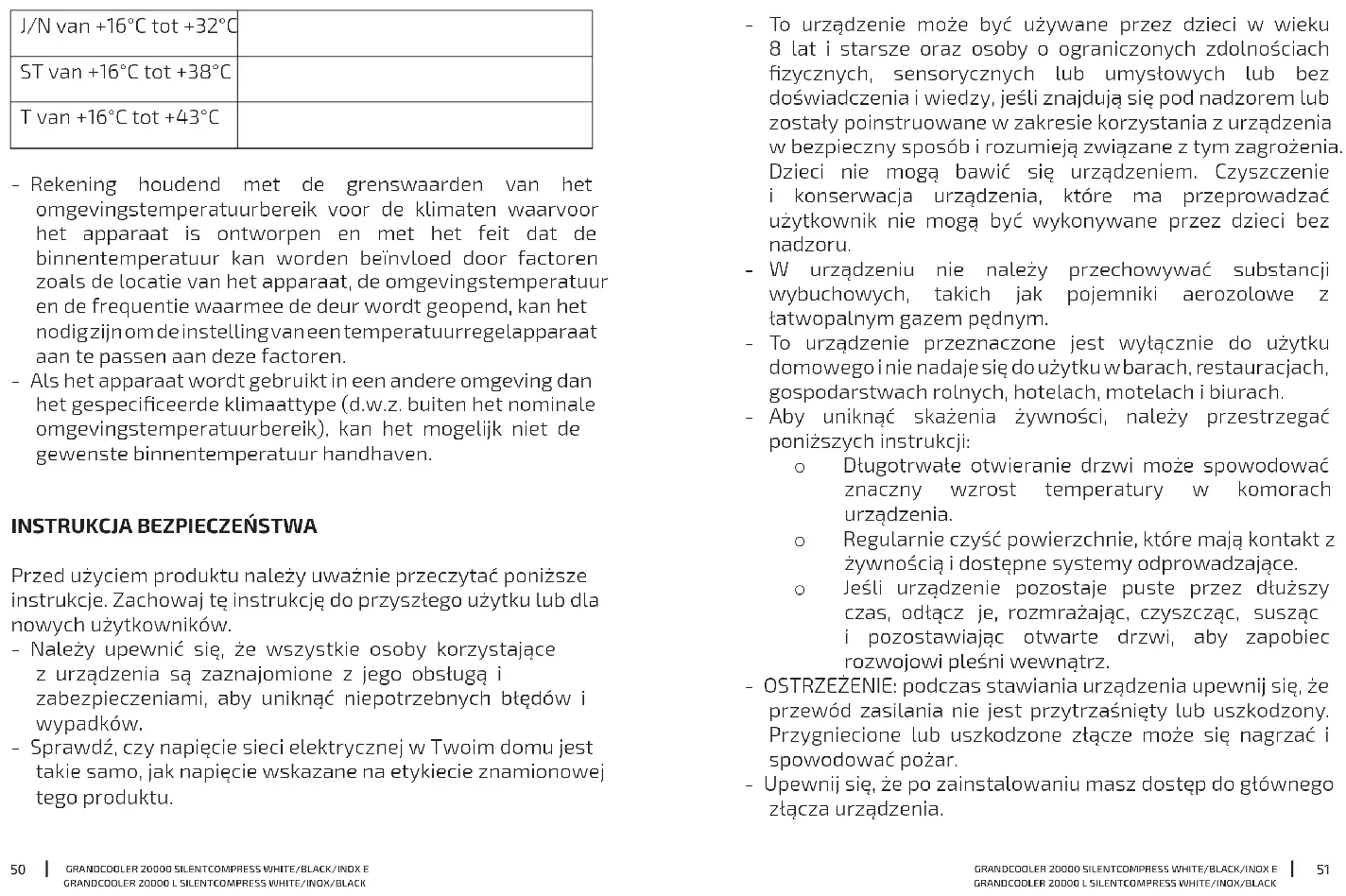 Ustawienie temperatury Obróć pokrętło, aby wybrać żądaną temperaturę. Liczba oznacza moc, a nie temperaturę. Porady - Gotowane mięso i ryby należy zawsze przechowywać na półce nad surowym mięsem i rybami, aby zapobiec przenoszeniu bakterii. Przechowuj surowe mięso i ryby w pojemniku wystarczająco dużym, aby zebrać soki i odpowiednio je przykryj. Umieść pojemnik na najniższej półce. - Pozostaw przestrzeń wokół żywności, aby umożliwić cyrkulację powietrza wewnątrz urządzenia. Upewnij się, że wszystkie części urządzenia są chłodne. - Aby zapobiec przenoszeniu smaku i wysuszeniu, pakuj lub przykrywaj żywność oddzielnie. Nie jest konieczne pakowanie owoców i warzyw. - Przed umieszczeniem wstępnie ugotowanej żywności w urządzeniu należy odczekać, aż ostygnie. Pomoże to utrzymać wewnętrzną temperaturę urządzenia. - Aby zapobiec utracie zimnego powietrza z urządzenia należy jak najrzadziej otwierać drzwi. Zalecamy otwieranie drzwi tylko wtedy, gdy trzeba włożyć lub wyjąć jedzenie. Wskazówki dotyczące oszczędzania energii - Staraj się nie otwierać drzwi zbyt często, zwłaszcza gdy jest gorąco i wilgotno. Po otwarciu drzwi zamknij je jak najszybciej. - Od czasu do czasu sprawdzaj, czy urządzenie jest odpowiednio wentylowane (odpowiednia cyrkulacja powietrza za urządzeniem). - W normalnych warunkach temperaturowych termostat należy ustawić w pozycji środkowej. Przed włożeniem do urządzenia opakowań ze świeżą żywnością należy upewnić się, że zostały one schłodzone do temperatury pokojowej. - Warstwy lodu i szronu zwiększają zużycie energii, dlatego należy czyścić urządzenie, gdy tylko warstwa ma grubość 3-5 mm. - Tylna ściana powinna być zawsze czysta, wolna od kurzu i jakiejkolwiek nieczystości. - Urządzenie powinno być umieszczone w najchłodniejszej części pomieszczenia, z dala od urządzeń wytwarzających ciepło lub kanałów grzewczych oraz z dala od bezpośredniego światła słonecznego. - Gorące jedzenie powinno ostygnąć do temperatury pokojowej przed umieszczeniem go w urządzeniu. Przeładowanie urządzenia powoduje dłuższą pracę sprężarki. Żywność, która chłodzi się powoli, może stracić na jakości lub ulec zepsuciu. - Pamiętaj, aby prawidłowo owinąć żywność i wysuszyć pojemniki przed umieszczeniem ich w urządzeniu. Zmniejsza to gromadzenie się szronu wewnątrz urządzenia. - Komora urządzenia nie może być wyłożona folią aluminiową, papierem woskowanym ani papierem kuchennym. Wyłożenie wnętrza zaburza cyrkulację zimnego powietrza, przez co urządzenie może być mniej wydajne. - Uporządkuj i oznacz żywność, aby ograniczyć otwieranie drzwi i długie wyszukiwania. Wyjmij jednorazowo tyle produktów, ile potrzebujesz i jak najszybciej zamknij drzwi.GRANDCOOLER 20000 SILENTCOMPRESS WHITE/BLACK/INOX E