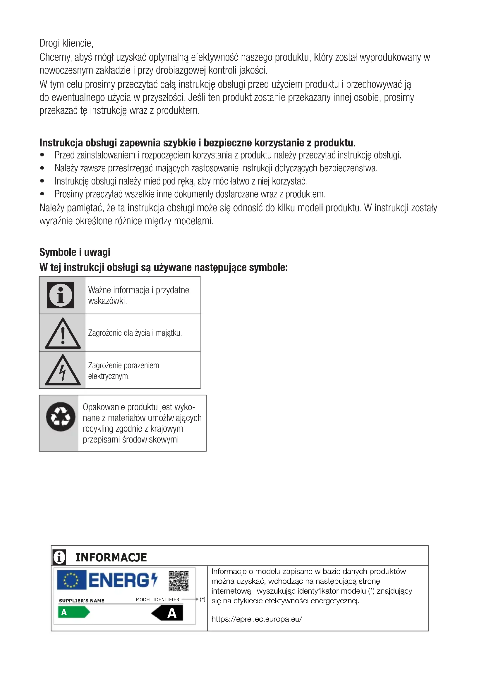 Ważne informacje i przydatne wskazówki. Zagrożenie dla życia i majątku. Zagrożenie porażeniem elektrycznym.Opakowanie produktu jest wyko-nane z materiałów umożlwiających recykling zgodnie z krajowymi przepisami środowiskowymi. INFORMACJE