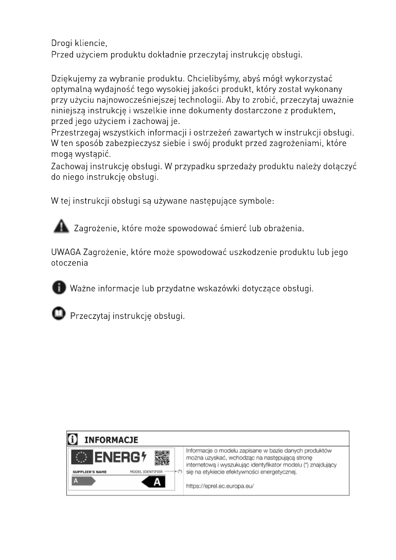 - Nasza firma nie ponosi odpowiedzialnościzaszkody, któremogąpowstaćw przypadkunieprzestrzegania instrukcji. Proceduryinstalacjiinaprawy musząbyćzawszewykonywane przezproducenta,autoryzowanego przedstawicielaserwisulub wykwalifikowanąosobęwskazaną przez importera. Używajtylkooryginalnychczęścii akcesoriów. Oryginalneczęścizamiennebędą dostępneprzez10latoddatyzakupu produktu. Nie naprawiaj ani nie wymieniaj żadnejczęściproduktu,chybażejest towyraźnieokreślonewinstrukcji obsługi. Niewprowadzajżadnychzmian technicznychwprodukcie.
