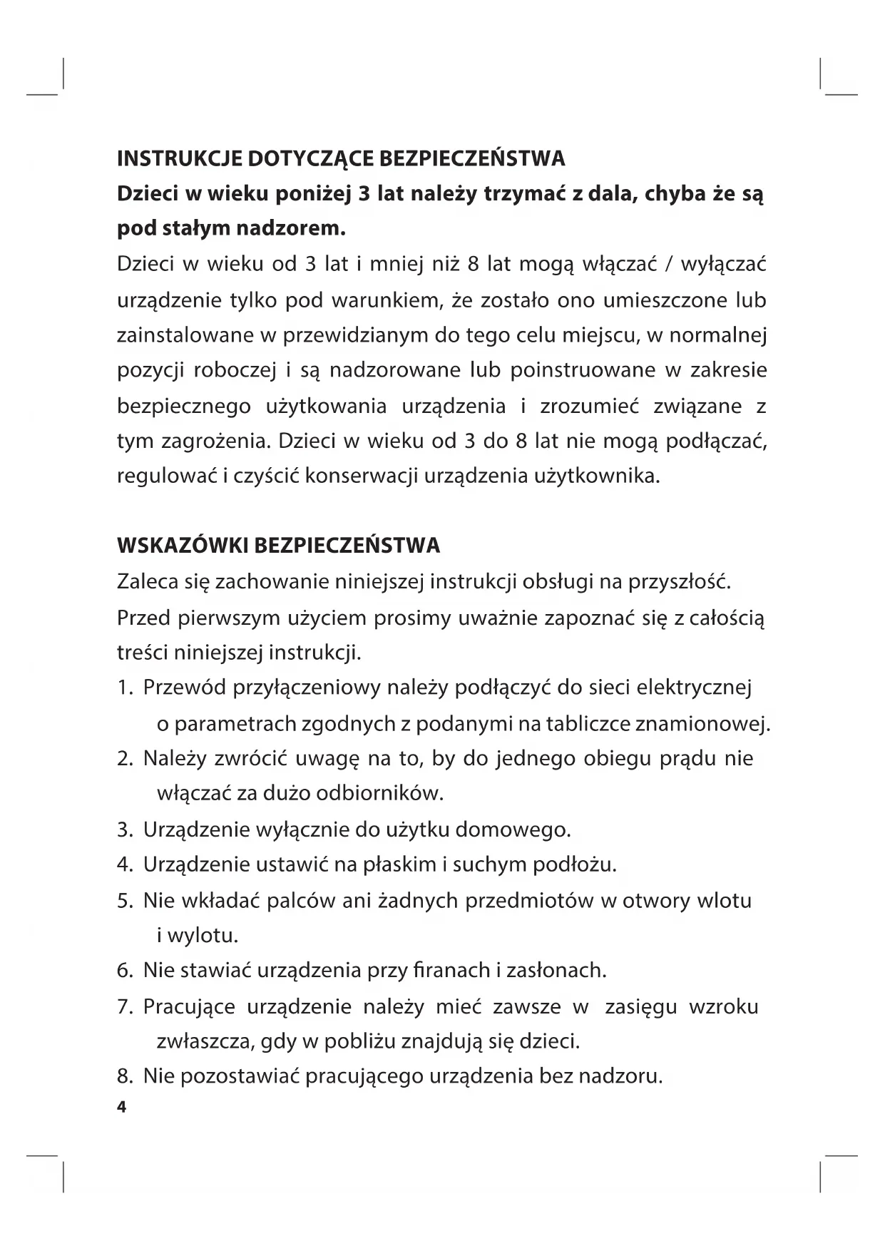 Dzieci wwieku poniżej 3 lat należy trzymać zdala, chyba że są pod stałym nadzorem. Dzieci w wieku od 3 lat i mniej niż 8 lat mogą włączać / wyłączać urządzenie tylko pod warunkiem, że zostało ono umieszczone lub zainstalowane w przewidzianym do tego celu miejscu, w normalnej pozycji roboczej i są nadzorowane lub poinstruowane w zakresie bezpiecznego użytkowania urządzenia i zrozumieć związane z tym zagrożenia. Dzieci w wieku od 3 do 8 lat nie mogą podłączać, regulować i czyścić konserwacji urządzenia użytkownika.