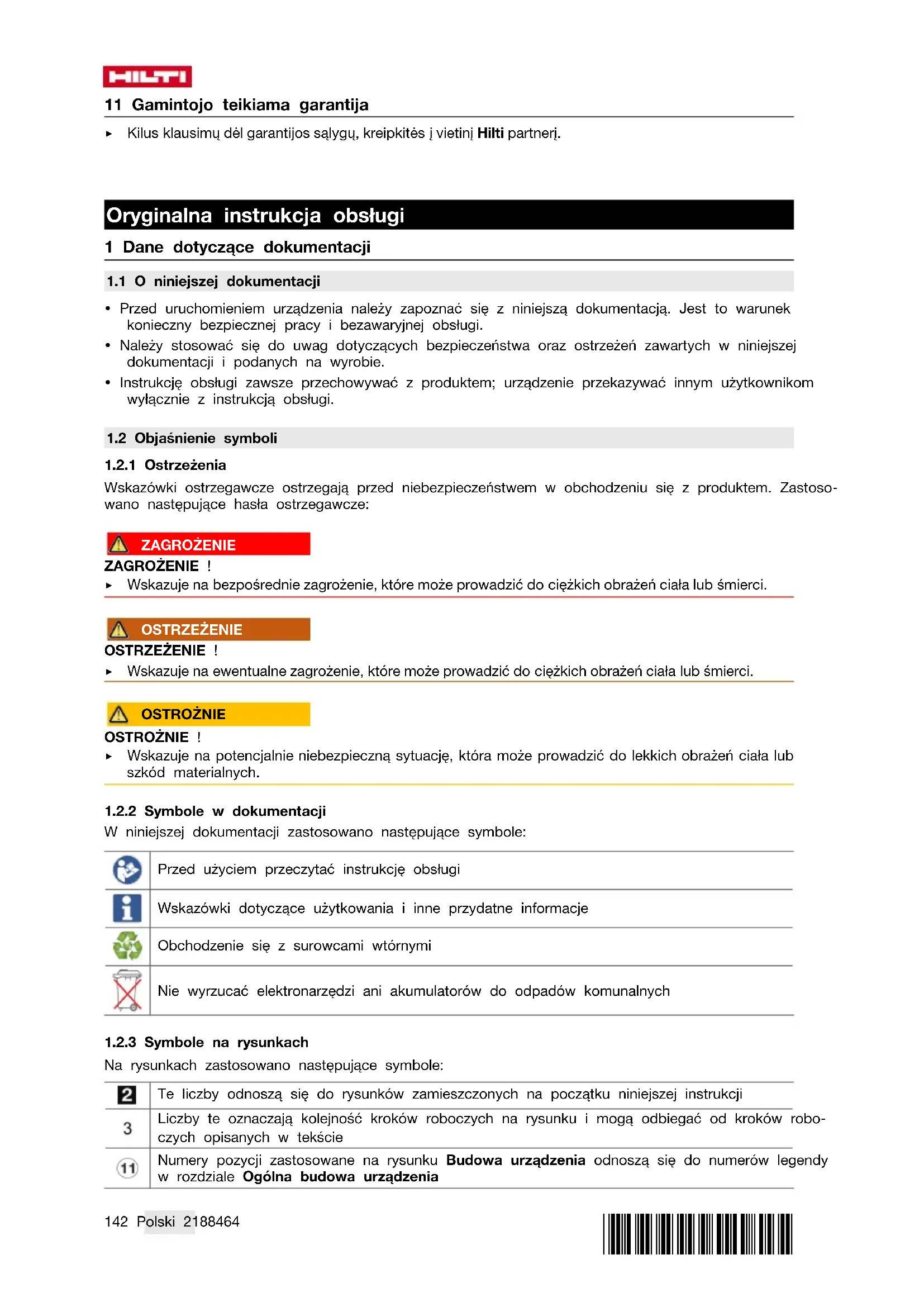 Deklarujemy z pełną odpowiedzialnością, że opisany tutaj produkt jest zgodny z obowiązującymi wytycznymi i normami. Kopia deklaracji zgodności znajduje się na końcu niniejszej dokumentacji. Techniczna dokumentacja zapisana jest tutaj: Hilti Entwicklungsgesellschaft mbH | Zulassung Geräte | Hiltistraße 6 | 86916 Kaufering, DE 2 Bezpieczeństwo
