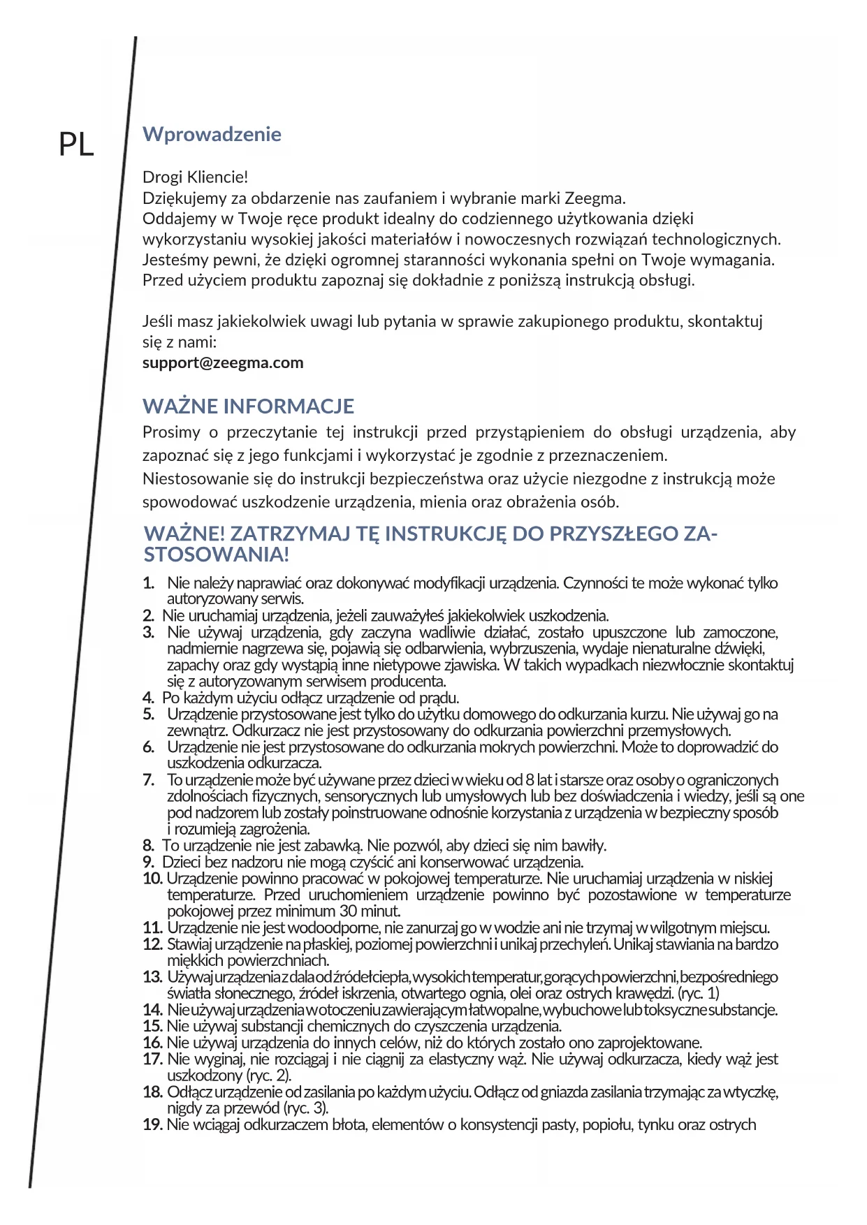 für Böden und Teppiche in Halterung am Staubsauger. Die Fotos sind anschaulich, das tatsächliche Aussehen der Produkte kann von der gezeigten Abbildung abweichen. Taste für Abrollen der Leitung 1PL Wprowadzenie Drogi Kliencie! Dziękujemy za obdarzenie nas zaufaniem i wybranie marki Zeegma. Oddajemy w Twoje ręce produkt idealny do codziennego użytkowania dzięki wykorzystaniu wysokiej jakości materiałów i nowoczesnych rozwiązań technologicznych. Jesteśmy pewni, że dzięki ogromnej staranności wykonania spełni on Twoje wymagania. Przed użyciem produktu zapoznaj się dokładnie z poniższą instrukcją obsługi. Jeśli masz jakiekolwiek uwagi lub pytania w sprawie zakupionego produktu, skontaktuj się z nami: support@zeegma.com