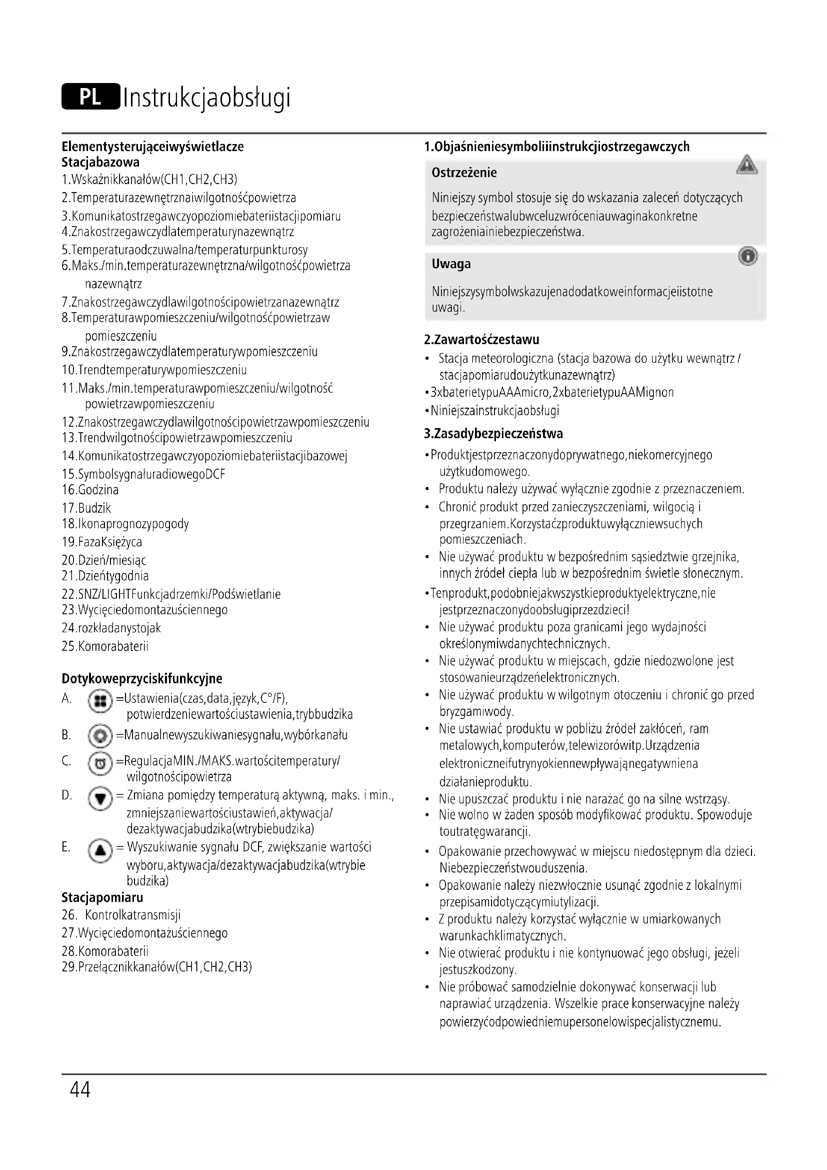 Stacja meteorologiczna Zasilanie elektryczne Stacja bazowa 4,5 V 3 x baterie AAA micro Zasilanie elektryczne Stacja pomiaru 3,0 V 2 x baterie AA Zakres pomiaru temperatury Wewnątrz: -10°C – +50°C / +14°F – +122°F Na zewnątrz: -40°C – +70°C / -40°F – +158°F Zakres pomiaru wilgotności powietrza 20% – 95% Maks. Liczba stacji pomiaru
