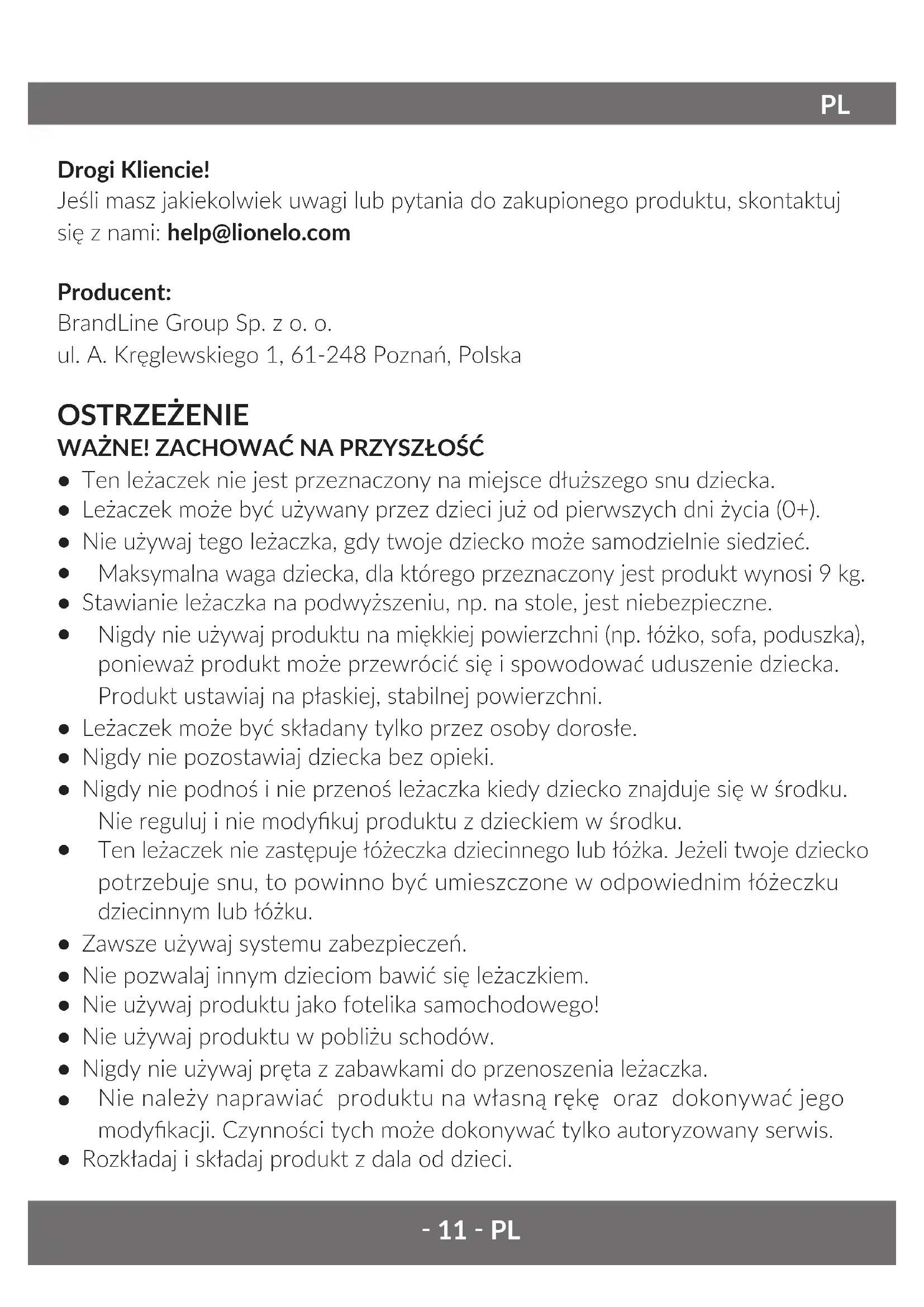 Ten leżaczek nie zastępuje łóżeczka dziecinnego lub łóżka. Jeżeli twoje dziecko potrzebuje snu, to powinno być umieszczone w odpowiednim łóżeczku dziecinnym lub łóżku.