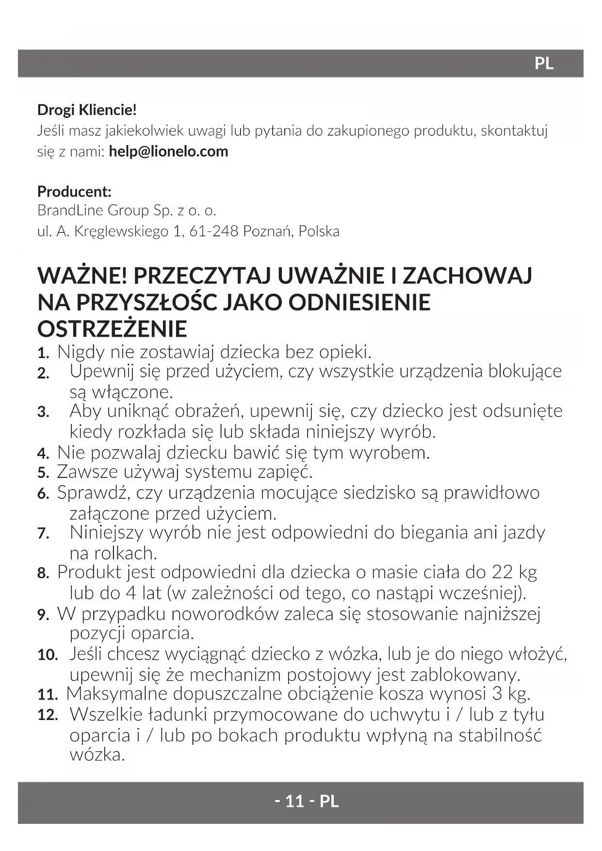 Wszelkie ładunki przymocowane do uchwytu i / lub z tyłu oparcia i / lub po bokach produktu wpłyną na stabilność wózka. PL‑ 12 ‑PL