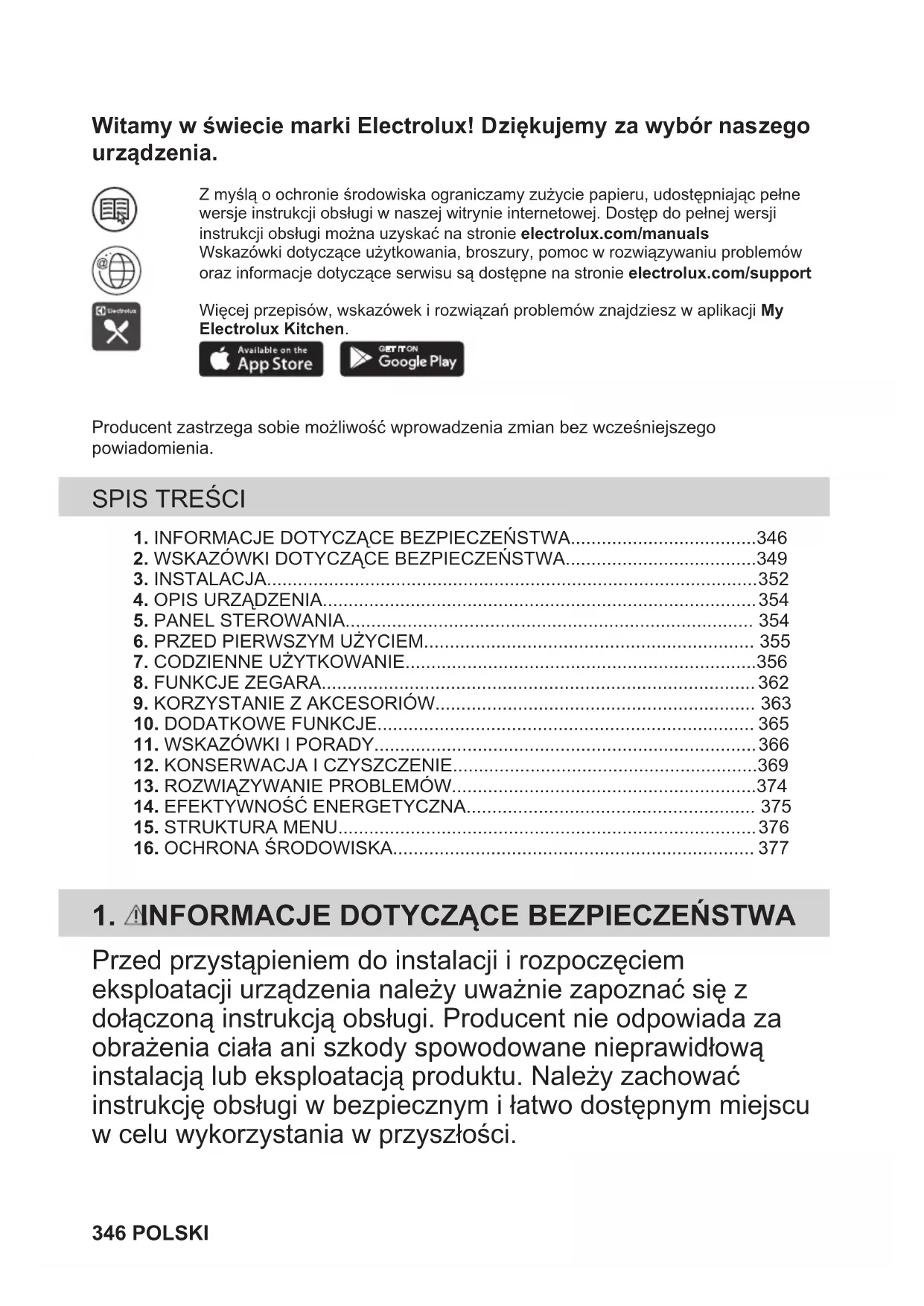 Materiały oznaczone symbolem należy poddać utylizacji. Opakowanie urządzenia włożyć do odpowiedniego pojemnika w celu przeprowadzenia recyklingu. Należy zadbać o ponowne przetwarzanie odpadów urządzeń elektrycznych i elektronicznych, aby chronić środowisko naturalne oraz ludzkie zdrowie. Nie wolno wyrzucać urządzeń oznaczonych symbolem razem z odpadami domowymi. Należy zwrócić produkt do miejscowego punktu ponownego przetwarzania lub skontaktować się z odpowiednimi władzami miejskimi. POLSKI 377Bine aţi venit la Electrolux! Vă mulțumim pentru că ați ales produsul nostru. În misiunea noastră de a fi sustenabili, reducem utilizarea hârtiei și oferim integralonline manualele de utilizare. Accesați manualul complet de utilizare la electrolux.com/manuals Găsiți sfaturi privind utilizarea, broșuri, informații pentru depanare, service și reparații la electrolux.com/support Pentru mai multe reţete, recomandări, depanare, descărcați aplicația My Electrolux Kitchen.Ne rezervãm dreptul asupra efectuãrii de modificãri. CUPRINS