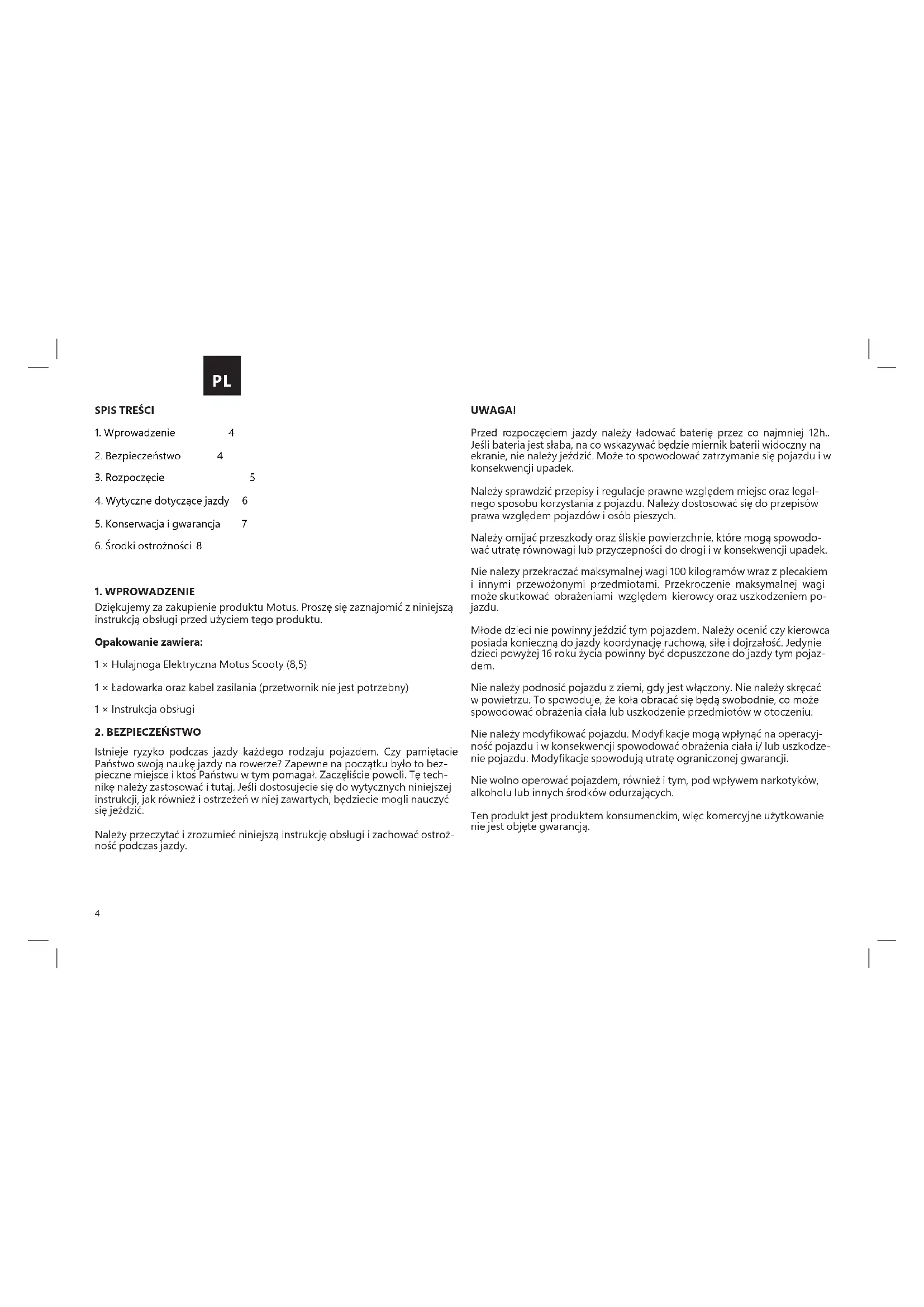 Dziękujemy za zakupienie produktu Motus. Proszę się zaznajomić z niniejszą instrukcją obsługi przed użyciem tego produktu. Opakowanie zawiera: 1 × Hulajnoga Elektryczna Motus Scooty (8,5) 1 × Ładowarka oraz kabel zasilania (przetwornik nie jest potrzebny) 1 × Instrukcja obsługi