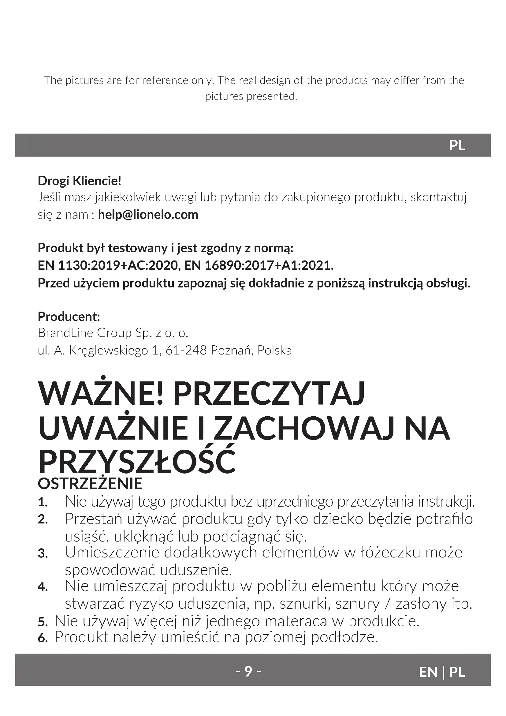 Drogi Kliencie! Jeśli masz jakiekolwiek uwagi lub pytania do zakupionego produktu, skontaktuj się z nami: help@lionelo.com Produkt był testowany i jest zgodny z normą: EN 1130:2019+AC:2020, EN 16890:2017+A1:2021. Przed użyciem produktu zapoznaj się dokładnie z poniższą instrukcją obsługi. Producent: BrandLine Group Sp. z o. o. ul. A. Kręglewskiego 1, 61-248 Poznań, Polska