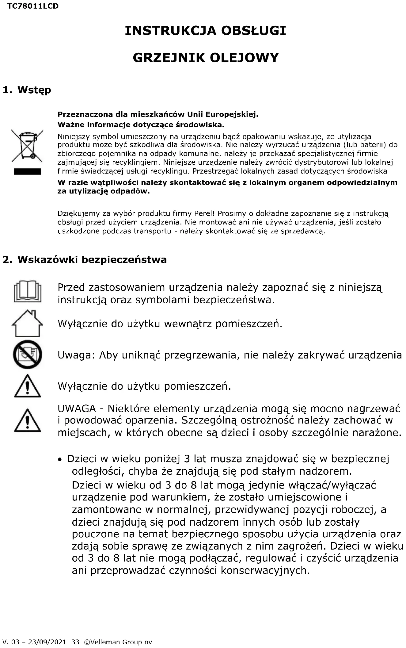 - Ten grzejnik wypełniony jest dokładną ilością specjalnego oleju. Naprawy wymagające otwarcia zbiornika oleju mogą być wykonywane wyłącznie przez producenta lub jego przedstawiciela serwisowego, z którym należy się skontaktować w przypadku wycieku oleju. Podczas złomowania grzejnika należy przestrzegać przepisów dotyczących usuwania oleju.TC78011LCD