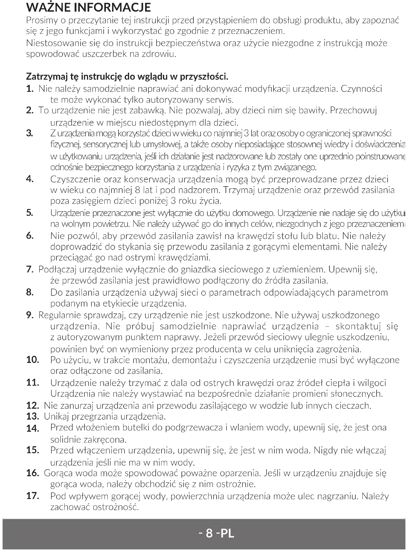 Czyszczenie oraz konserwacja urządzenia mogą być przeprowadzane przez dzieci w wieku co najmniej 8 lat i pod nadzorem. Trzymaj urządzenie oraz przewód zasilania poza zasięgiem dzieci poniżej 3 roku życia.
