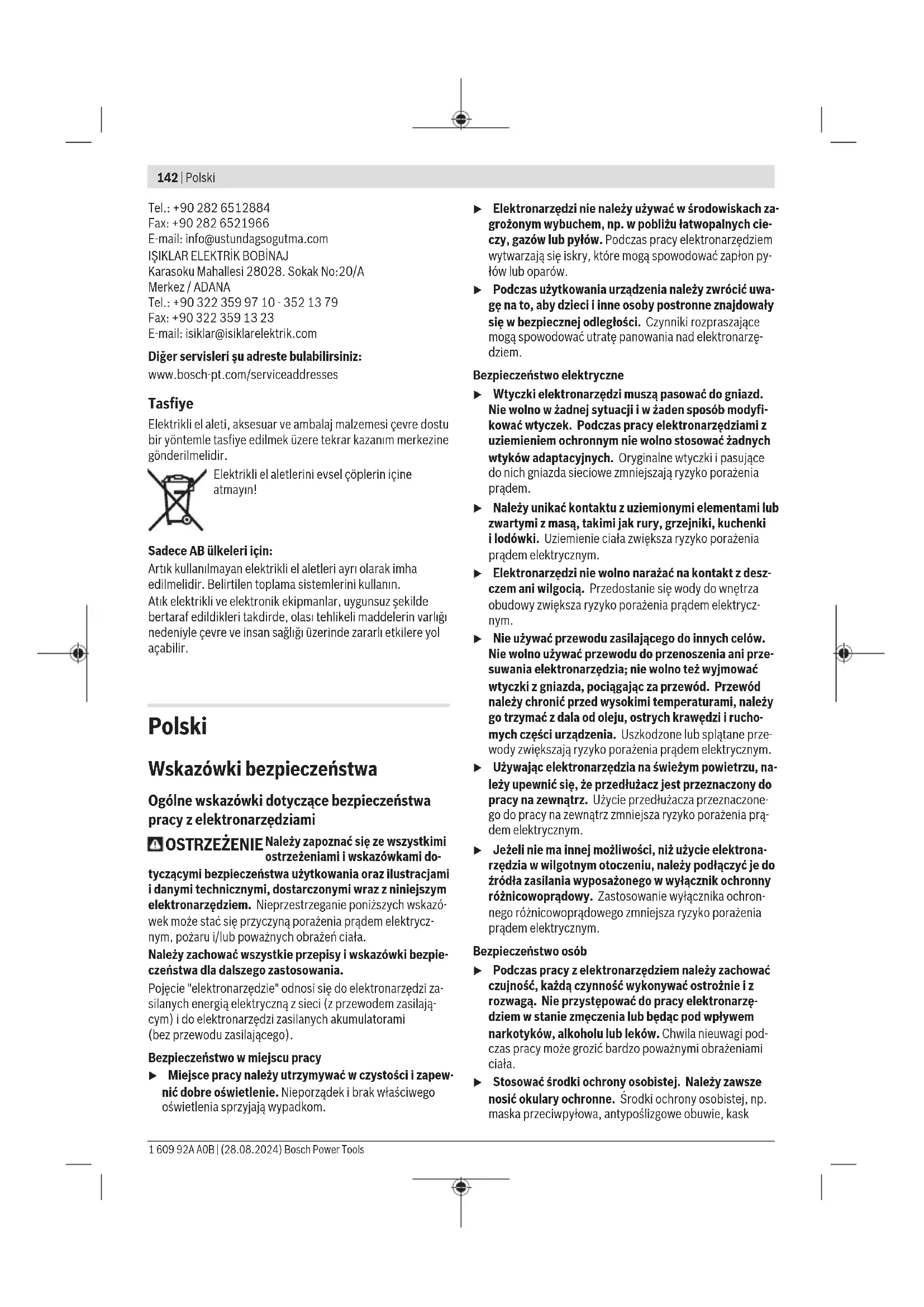 Karasoku Mahallesi 28028. Sokak No:20/A Merkez / ADANA Tel.: +903223599710 -3521379 Fax: +903223591323 E-mail: isiklar@isiklarelektrik.com Diğer servisleri şu adreste bulabilirsiniz: www.bosch-pt.com/serviceaddresses Tasfiye Elektrikli el aleti, aksesuar ve ambalaj malzemesi çevre dostu bir yöntemle tasfiye edilmek üzere tekrar kazanım merkezine gönderilmelidir. Elektrikli el aletlerini evsel çöplerin içine atmayın! Sadece AB ülkeleri için: Artık kullanılmayan elektrikli el aletleri ayrı olarak imha edilmelidir. Belirtilen toplama sistemlerini kullanın. Atık elektrikli ve elektronik ekipmanlar, uygunsuz şekilde bertaraf edildikleri takdirde, olası tehlikeli maddelerin varlığı nedeniyle çevre ve insan sağlığı üzerinde zararlı etkilere yol açabilir. Polski Wskazówki bezpieczeństwa Ogólne wskazówki dotyczące bezpieczeństwa pracy z elektronarzędziami OSTRZEŻENIE Należy zapoznać się ze wszystkimi ostrzeżeniami i wskazówkami do- tyczącymi bezpieczeństwa użytkowania oraz ilustracjami i danymi technicznymi, dostarczonymi wraz z niniejszym elektronarzędziem. Nieprzestrzeganie poniższych wskazó- wek może stać się przyczyną porażenia prądem elektrycz- nym, pożaru i/lub poważnych obrażeń ciała. Należy zachować wszystkie przepisy i wskazówki bezpie- czeństwa dla dalszego zastosowania. Pojęcie "elektronarzędzie" odnosi się do elektronarzędzi za- silanych energią elektryczną z sieci (z przewodem zasilają- cym) i do elektronarzędzi zasilanych akumulatorami (bezprzewodu zasilającego). Bezpieczeństwo w miejscu pracy u Miejsce pracy należy utrzymywać w czystości i zapew- nić dobre oświetlenie. Nieporządek i brak właściwego oświetlenia sprzyjają wypadkom. u Elektronarzędzi nie należy używać w środowiskach za- grożonym wybuchem, np. w pobliżu łatwopalnych cie- czy, gazów lub pyłów. Podczas pracy elektronarzędziem wytwarzają się iskry, które mogą spowodować zapłon py- łów lub oparów. u Podczas użytkowania urządzenia należy zwrócić uwa- gę na to, aby dzieci i inne osoby postronne znajdowały się w bezpiecznej odległości. Czynniki rozpraszające mogą spowodować utratę panowania nad elektronarzę- dziem. Bezpieczeństwo elektryczne u Wtyczki elektronarzędzi muszą pasować do gniazd. Nie wolno w żadnej sytuacji i w żaden sposób modyfi- kować wtyczek. Podczas pracy elektronarzędziami z uziemieniem ochronnym nie wolno stosować żadnych wtyków adaptacyjnych. Oryginalne wtyczki i pasujące do nich gniazda sieciowe zmniejszają ryzyko porażenia prądem. u Należy unikać kontaktu z uziemionymi elementami lub zwartymi z masą, takimi jak rury, grzejniki, kuchenki ilodówki. Uziemienie ciała zwiększa ryzyko porażenia prądem elektrycznym. u Elektronarzędzi nie wolno narażać na kontakt z desz- czem ani wilgocią. Przedostanie się wody do wnętrza obudowy zwiększa ryzyko porażenia prądem elektrycz- nym. u Nie używać przewodu zasilającego do innych celów. Nie wolno używać przewodu do przenoszenia ani prze- suwania elektronarzędzia; nie wolno też wyjmować wtyczki z gniazda, pociągając za przewód. Przewód należy chronić przed wysokimi temperaturami, należy go trzymać zdala od oleju, ostrych krawędzi i rucho- mych części urządzenia. Uszkodzone lub splątane prze- wody zwiększają ryzyko porażenia prądem elektrycznym. u Używając elektronarzędzia na świeżym powietrzu, na- leży upewnić się, że przedłużacz jest przeznaczony do pracy na zewnątrz. Użycie przedłużacza przeznaczone- go do pracy na zewnątrz zmniejsza ryzyko porażenia prą- dem elektrycznym. u Jeżeli nie ma innej możliwości, niż użycie elektrona- rzędzia w wilgotnym otoczeniu, należy podłączyć je do źródła zasilania wyposażonego w wyłącznik ochronny różnicowoprądowy. Zastosowanie wyłącznika ochron- nego różnicowoprądowego zmniejsza ryzyko porażenia prądem elektrycznym. Bezpieczeństwo osób u Podczas pracy z elektronarzędziem należy zachować czujność, każdą czynność wykonywać ostrożnie i z rozwagą. Nie przystępować do pracy elektronarzę- dziem w stanie zmęczenia lub będąc pod wpływem narkotyków, alkoholu lub leków. Chwila nieuwagi pod- czas pracy może grozić bardzo poważnymi obrażeniami ciała. u Stosować środki ochrony osobistej. Należy zawsze nosić okulary ochronne. Środki ochrony osobistej, np. maska przeciwpyłowa, antypoślizgowe obuwie, kask 1 609 92A A0B | (28.08.2024) Bosch Power ToolsPolski | 143 ochronny czy ochraniacze na uszy, w określonych warun- kach pracy obniżają ryzyko obrażeń ciała. u Należy unikać niezamierzonego uruchomienia narzę- dzia. Przed podłączeniem elektronarzędzia do źródła zasilania i/lub podłączeniem akumulatora, podniesie- niem albo transportem urządzenia, należy upewnić się, że włącznik elektronarzędzia znajduje się w pozy- cji wyłączonej. Przenoszenie elektronarzędzia z palcem opartym na włączniku/wyłączniku lub włożenie do gniaz- da sieciowego wtyczki włączonego narzędzia, może stać się przyczyną wypadków. u Przed włączeniem elektronarzędzia należy usunąć wszystkie narzędzia nastawcze i klucze maszynowe. Narzędzia lub klucze, pozostawione wruchomych czę- ściach urządzenia, mogą spowodować obrażenia ciała. u Należy unikać nienaturalnych pozycji przy pracy. Na- leży dbać o stabilną pozycję przy pracy i zachowanie równowagi. Dzięki temu można będzie łatwiej zapano- wać nad elektronarzędziem w nieprzewidzianych sytu- acjach. u Należy nosić odpowiednią odzież. Nie należy nosić luźnej odzieży ani biżuterii. Włosy i odzież należy trzy- mać z dala od ruchomych części. Luźna odzież, biżuteria lub długie włosy mogą zostać pochwycone przez ruchome części. u Jeżeli producent przewidział możliwość podłączenia odkurzacza lub systemu odsysania pyłu, należy upew- nić się, że są one podłączone i są prawidłowo s
