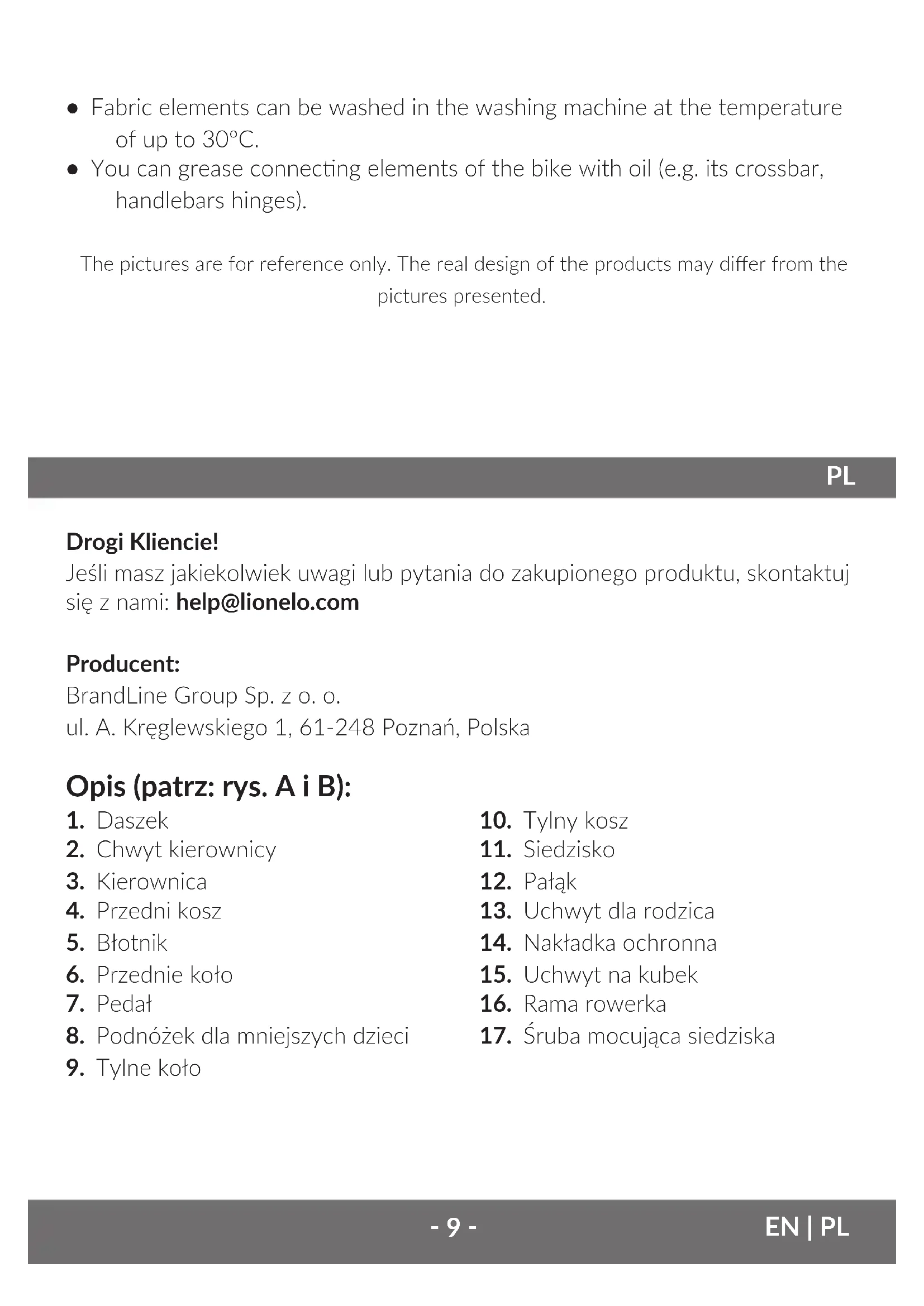 Drogi Kliencie! Jeśli masz jakiekolwiek uwagi lub pytania do zakupionego produktu, skontaktuj się z nami: help@lionelo.com Producent: BrandLine Group Sp. z o. o. ul. A. Kręglewskiego 1, 61-248 Poznań, Polska Opis (patrz: rys. A i B):