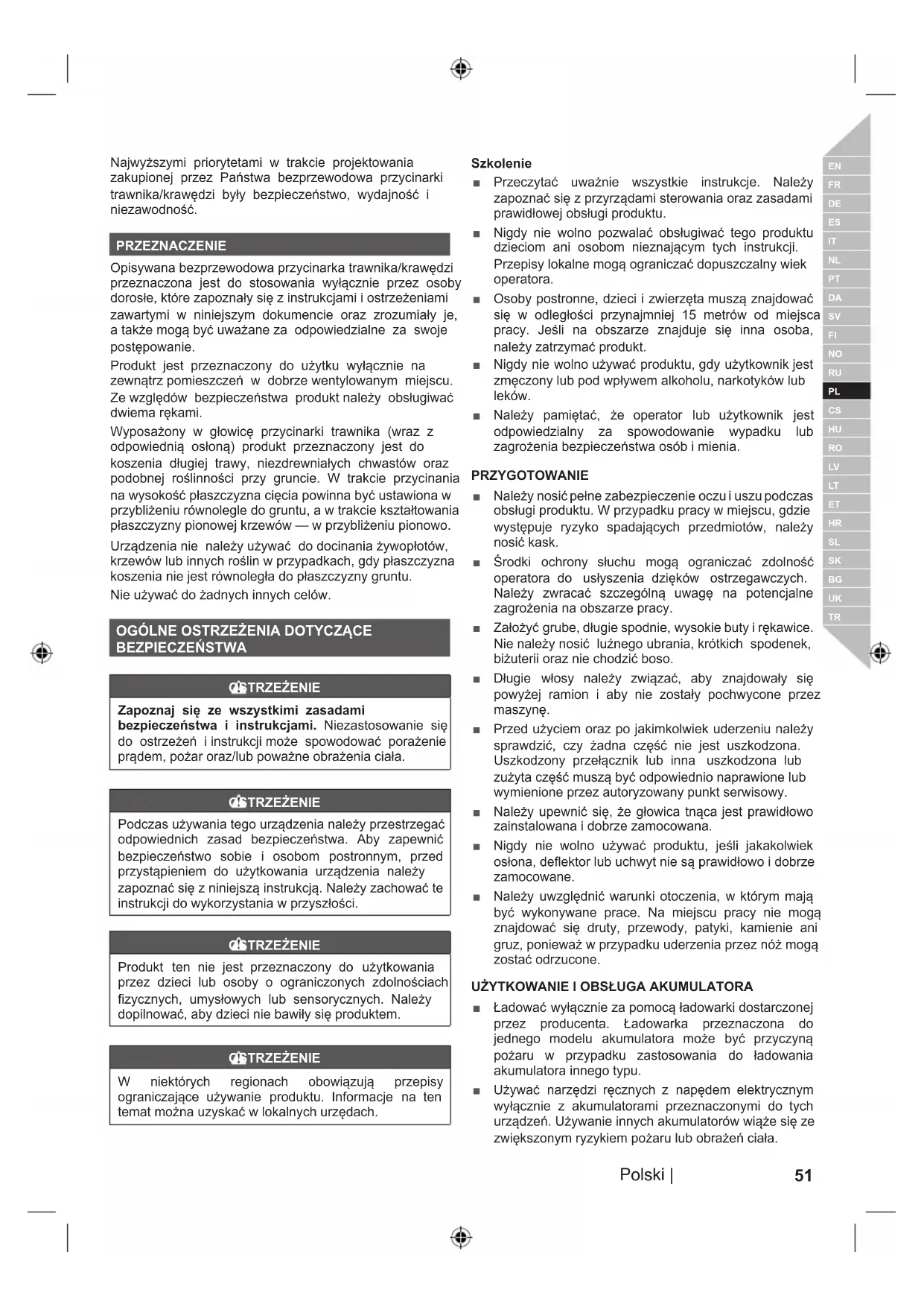 ■ Nie wolno pozwalać używać tego produktu dzieciom lub osobom o ograniczonych zdolnościach fizycznych, sensorycznych lub umysłowych ani osobom, które nie przeczytały tych instrukcji. ■ Produkt należy używać przy świetle dziennym lub przy dobrym oświetleniu sztucznym. ■ Unikać używania urządzenia do mokrej trawy. ■ Zawsze należy dbać o prawidłowe oparcie nóg oraz o zachowanie równowagi, szczególnie na zboczach. ■ Podczas używania produktu nie należy chodzić do tyłu. ■ Podczas pracy należy chodzić, nie wolno biegać. ■ Głowica tnąca musi znajdować się poniżej linii pasa. ■ Nie używać produktu z uszkodzonymi osłonami lub bez założonych osłon. ■ Nie wolno zastępować żyłki linką metalową. ■ Trzymać dłonie i stopy z dala od elementów tnących przez cały czas pracy, a szczególnie podczas uruchamiania silnika. ■ Uwaga: ostrza nadal obracają się po wyłączeniu silnika. ■ Należy zwrócić uwagę na obiekty odrzucane przez elementy tnące. Przed rozpoczęciem pracy należy usunąć małe kamienie, gruz oraz inne obce obiekty z miejsca pracy. Druty lub sznurki mogą zostać pochwycone przez przyrząd tnący. ■ Wyłącz i wyjmij pakiet akumulatora przed: ● serwisowanie ● pozostawianie produktu bez nadzoru ● czyszczenie produktu ● wymiana akcesoriów ● kontrola uszkodzeń po uderzeniu obiektu ● kontrola uszkodzeń w przypadku, gdy produkt wpada w nietypowe drgania ● konserwacja ■ Należy nosić pełne zabezpieczenie oczu i uszu podczas obsługi produktu. W przypadku pracy w miejscu, gdzie występuje ryzyko spadających przedmiotów, należy nosić kask. ■ Środki ochrony słuchu mogą ograniczać zdolność operatora do usłyszenia dzięków ostrzegawczych. Należy zwracać szczególną uwagę na potencjalne zagrożenia na obszarze pracy. ■ Założyć grube, długie spodnie, wysokie buty i rękawice. Nie należy nosić luźnego ubrania, krótkich spodenek, biżuterii oraz nie chodzić boso. ■ Długie włosy należy związać, aby znajdowały się powyżej ramion i aby nie zostały pochwycone przez maszynę. ■ Mały nóż zamontowany na osłonie służy do przycinania nowo wysuniętej żyłki na prawidłową długość w celu zapewnienia bezpiecznego i optymalnego funkcjonowania. Jest ostry, nie należy go dotykać, szczególnie podczas czyszczenia produktu. ■ Otwory wentylacyjne należy utrzymywać w stanie wolnym od zanieczyszczeń. ■ Przed użyciem oraz po jakimkolwiek uderzeniu należy sprawdzić, czy żadna część nie jest uszkodzona. Uszkodzony przełącznik lub inna uszkodzona lub zużyta część muszą być odpowiednio naprawione lub wymienione przez autoryzowany punkt serwisowy. ■ Należy upewnić się, że głowica tnąca jest prawidłowo zainstalowana i dobrze zamocowana. ■ Upewnić się, że wszystkie elementy zabezpieczające, osłony i uchwyty są prawidłowo i bezpiecznie zamocowane. ■ Nie należy w żadem sposób modyfikować produktu; może to spowodować większe ryzyko obrażeń ciała operatora lub innych osób. ■ Należy stosować wyłącznie żyłkę tnącą producenta. Nie używaj żadnych innych akcesoriów tnących. ■ W razie wypadku lub awarii należy natychmiast wyłączyć urządzenie i wyjąć z niego baterię. Nie należy włączać produktu ponownie, dopóki nie zostanie w pełni sprawdzony przez autoryzowane centrum serwisowe. OSTRZEŻENIE Przed każdym użyciem upewnić się, czy ostrze do odcinania żyłki w osłonie jest prawidłowo ustawione i przymocowane.