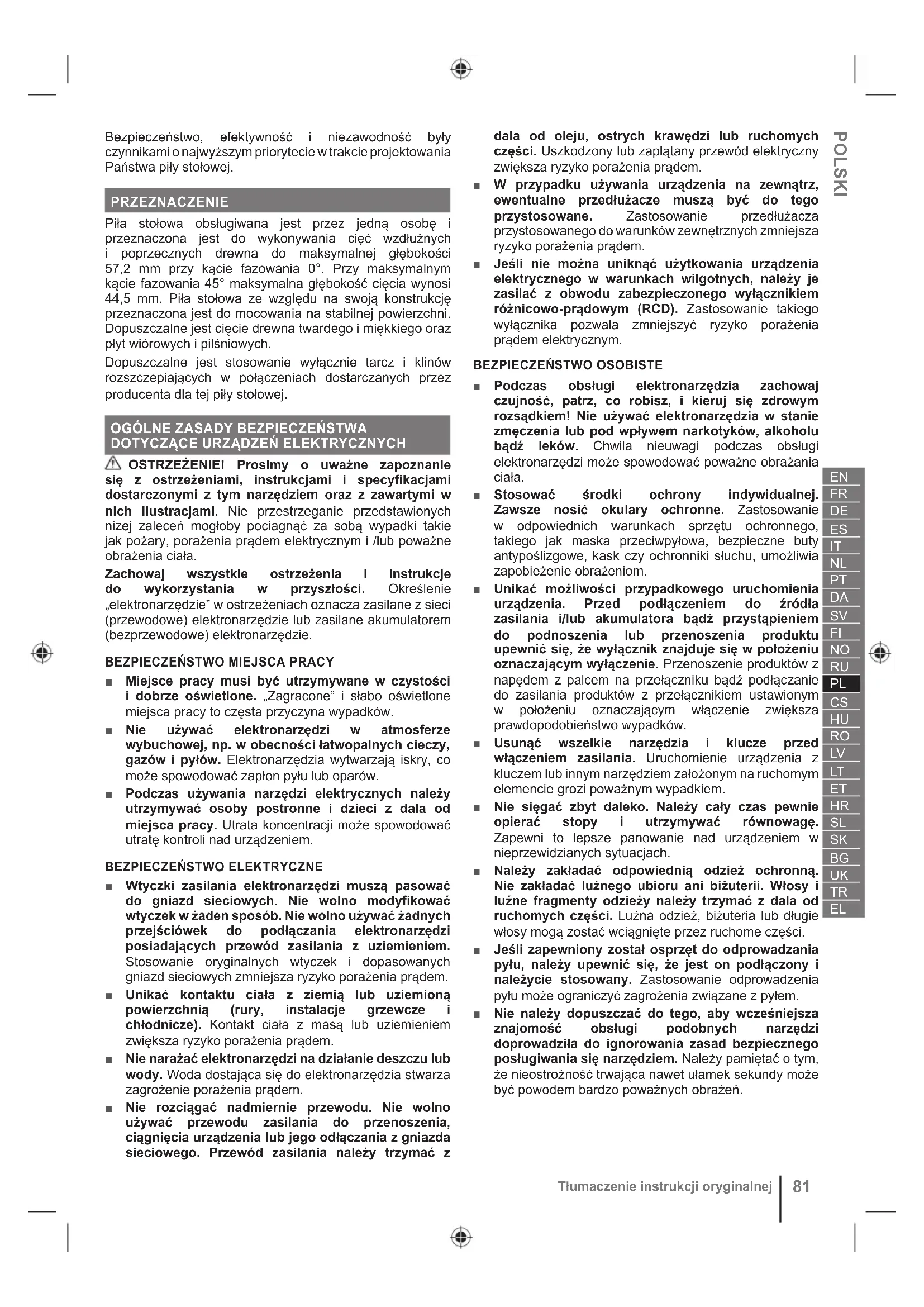 Tłumaczenie instrukcji oryginalnej■ Ustawić klin rozszczepiający w sposób opisany w niniejszej instrukcji obsługi. Niewłaściwe odstępy, ustawienie i wyrównanie mogą sprawić, że klin rozszczepiający nie będzie skutecznie zmniejszać prawdopodobieństwa zjawiska odrzutu. ■ Aby klin rozszczepiający i zapadki przeciwodrzutowe działały prawidłowo, muszą mieć dobry kontakt z obrabianym elementem. Klin rozszczepiający i zapadki przeciwodrzutowe są nieskuteczne podczas cięcia elementów, które są zbyt krótkie, aby można je było zablokować za pomocą klina rozszczepiającego i zapadek przeciwodrzutowych. W takich warunkach nie można zapobiec zjawisku odrzutu za pomocą klina rozszczepiającego i zapadek przeciwodrzutowych. ■ Należy zastosować tarczę tnącą dopasowaną do wymiarów klina rozszczepiającego. Aby klin rozszczepiający mógł prawidłowo spełniać swoje zadanie, średnica tarczy tnącej musi być do niego dopasowana, korpus tarczy musi być cieńszy niż sam klin rozszczepiający, a szerokość cięcia ostrza tnącego tarczy musi być większa niż grubość klina rozszczepiającego. FOSTRZEŻENIA DOTYCZĄCE PROCEDUR CIĘCIA ■ NIEBEZPIECZEŃSTWO! Nigdy nie umieszczać palców ani dłoni w pobliżu tarczy tnącej lub na torze jej ruchu. Chwila nieuwagi lub poślizgnięcie się mogą spowodować skierowanie dłoni w stronę tarczy tnącej i doprowadzić do poważnych obrażeń ciała. ■ Obrabiany przedmiot należy posuwać w stronę tarczy tnącej wyłącznie przeciwnie do kierunku jej obrotów. Przesuwanie obrabianego przedmiotu w tym samym kierunku, w którym obraca się tarcza tnąca nad stołem, może spowodować wciągnięcie takiego obrabianego przedmiotu oraz dłoni w kierunku tarczy. ■ Nigdy nie używać kątomierza do pomiaru ukosu do podawania przedmiotu obrabianego podczas cięcia wzdłużnego, a ponadto nie używać prowadnicy jako ogranicznika długości podczas cięcia poprzecznego z kątomierzem do pomiaru ukosu. Jednoczesne prowadzenie elementu za pomocą prowadnicy i kątomierza do pomiaru ukosu zwiększa prawdopodobieństwo zaklinowania się tarczy tnącej i wystąpienia zjawiska odrzutu. ■ W trakcie cięcia wzdłużnego należy zawsze przykładać siłę przesuwającą przedmiot obrabiany pomiędzy prowadnicą a tarczą tnącą. Używać popychacza w formie drążka, gdy odległość między prowadnicą a tarczą tnącą jest mniejsza niż 150 mm, a ponadto używać popychacza w formie bloku, gdy odległość ta jest mniejsza niż 50 mm. Przyrządy „pomagające w pracy” pozwalają na utrzymanie dłoni w bezpiecznej odległości od tarczy tnącej. ■ Należy używać wyłącznie popychacza w formie drążka dostarczonego przez producenta lub skonstruowanego zgodnie z instrukcją. Ten popychacz w formie drążka zapewnia wystarczającą odległość dłoni od tarczy tnącej. ■ Nigdy nie używać uszkodzonego lub przeciętego popychacza w formie drążka. Uszkodzony popychacz w formie drążka może się złamać i spowodować poślizg dłoni w kierunku tarczy tnącej. ■ Nie należy wykonywać jakichkolwiek prac bez przyrządów pomocniczych. Do ustalania położenia i prowadzenia przedmiotu obrabianego należy zawsze używać prowadnicy lub kątomierza do pomiaru kąta ukosu. Praca bez przyrządów pomocniczych oznacza podpieranie i prowadzenie przedmiotu obrabianego dłońmi, w przeciwieństwie do prowadnicy lub kątomierza do pomiaru kąta ukosu. Piłowanie bez przyrządów pomocniczych prowadzi do krzywienia się, klinowania oraz zjawiska odrzutu. ■ Nigdy nie sięgać wokół obracającej się tarczy tnącej lub nad nią. Sięganie po obrabiany przedmiot może prowadzić do przypadkowego kontaktu z tarczą tnącą. ■ W przypadku długich i/lub szerokich przedmiotów obrabianych należy zapewnić ich pomocnicze podparcie z tyłu i/lub po bokach stołu piły, aby utrzymać je w poziomie. Długie i/lub szerokie przedmioty obrabiane mają tendencję do obracania się na krawędzi stołu, co powoduje utratę kontroli, klinowanie sie piły i zjawisko odrzutu. ■ Należy zapewnić równomierny posuw przedmiotu obrabianego. Nie zginać ani nie skręcać przedmiotu obrabianego. W przypadku zakleszczenia należy natychmiast wyłączyć produkt, odłączyć go od zasilania, a następnie usunąć zakleszczenie. Zakleszczenie tarczy przez przedmiot obrabiany może spowodować zjawisko odrzutu lub unieruchomienie silnika. ■ Nie należy usuwać fragmentów odciętego materiału podczas pracy piły. Materiał może zostać uwięziony pomiędzy prowadnicą lub wewnętrzną powierzchnią osłony piły a tarczą tnącą, co może spowodować pociągnięcie palców w kierunku tarczy. Przed przystąpieniem do usuwania materiału należy wyłączyć piłę i poczekać, aż tarcza się zatrzyma. ■ W trakcie cięcia wzdłużnego elementów o grubości poniżej 2 mm należy stosować prowadnicą pomocniczą stykającą się z blatem stołu. Cienki przedmiot obrabiany może zaklinować się pod prowadnicą i spowodować zajwisko odrzutu. PRZYCZYNY ODRZUTU I POWIĄZANE OSTRZEŻENIA Zjawisko odrzutu jest nagłą reakcją przedmiotu obrabianego spowodowaną ściśnięciem i zakleszczeniem tarczy tnącej, niewłaściwym ustawieniem toru cięcia w przedmiocie obrabianym w stosunku do tarczy tnącej lub zaklinowaniem się części przedmiotu obrabianego między brzeszczotem a prowadnicą lub innym przedmiotem zamocowanym. Podczas odrzutu przedmiot obrabiany jest najczęściej podnoszony ze stołu przez tylną część tarczy tnącej i wyrzucany w kierunku operatora. Odbicie jest wynikiem złego użycia narzędzia i /lub niepoprawnego sposobu lub warunków cięcia. Można go uniknąć podejmując środki ostrożności. ■ Nigdy nie stawać bezpośrednio na torze ruchu tarczy. Należy zawsze ustawiać ciało po tej samej stronie piły, co prowadnica. Zjawisko odrzutu może spowodować wyrzut przedmiotu obrabianego z dużą prędkoś