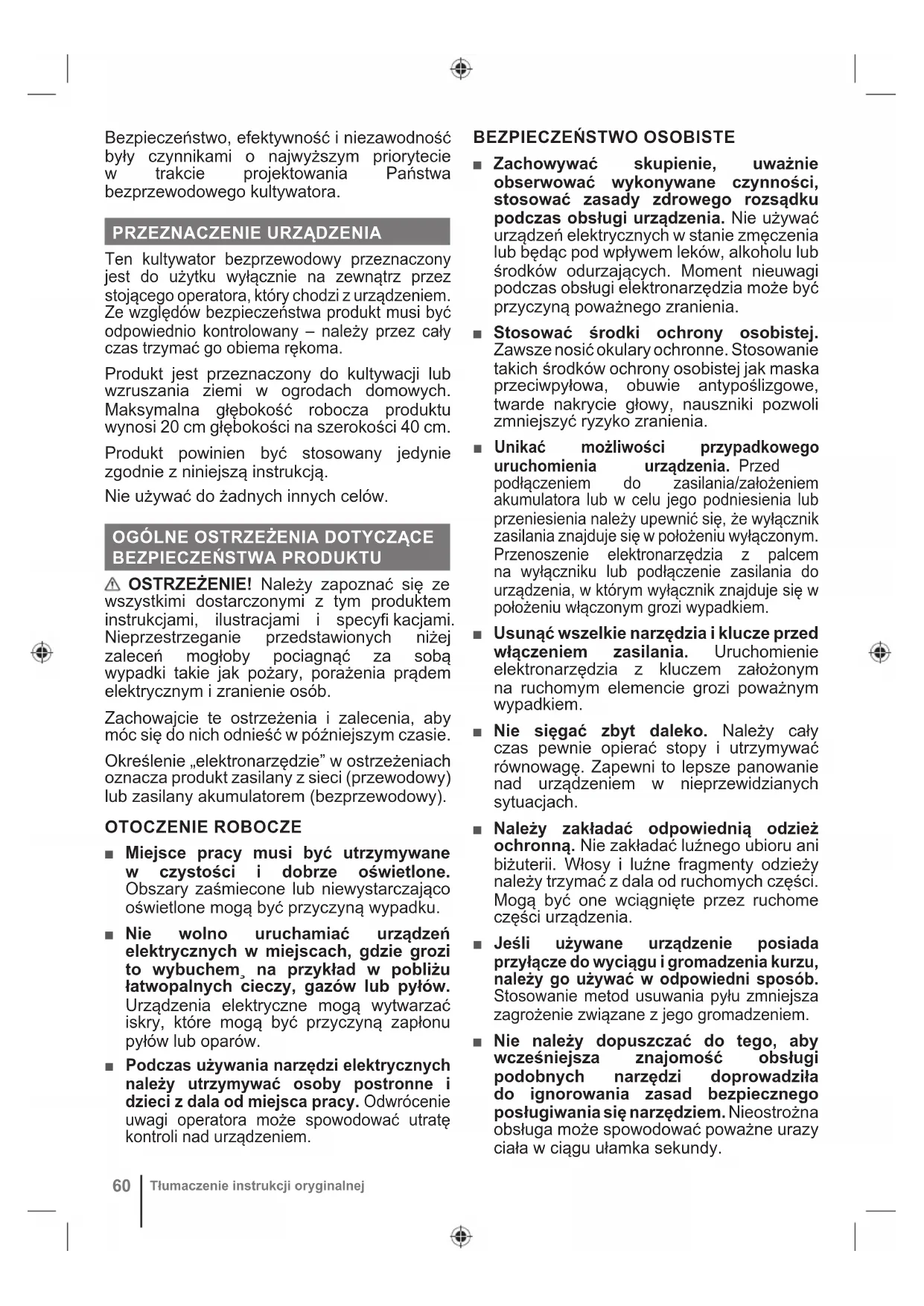 Tłumaczenie instrukcji oryginalnej Bezpieczeństwo, efektywność i niezawodność były czynnikami o najwyższym priorytecie w trakcie projektowania Państwa bezprzewodowego kultywatora.