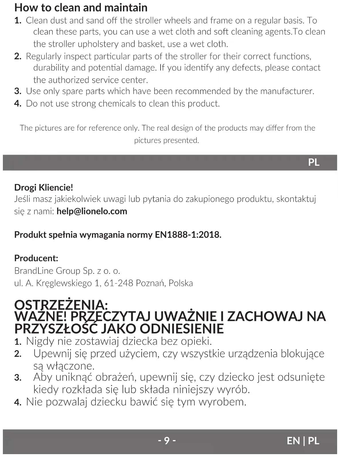 The pictures are for reference only. The real design of the products may dier from the pictures presented. Drogi Kliencie! Jeśli masz jakiekolwiek uwagi lub pytania do zakupionego produktu, skontaktuj się z nami: help@lionelo.com Produkt spełnia wymagania normy EN1888-1:2018. Producent: BrandLine Group Sp. z o. o. ul. A. Kręglewskiego 1, 61-248 Poznań, Polska OSTRZEŻENIA: WAŻNE! PRZECZYTAJ UWAŻNIE I ZACHOWAJ NA