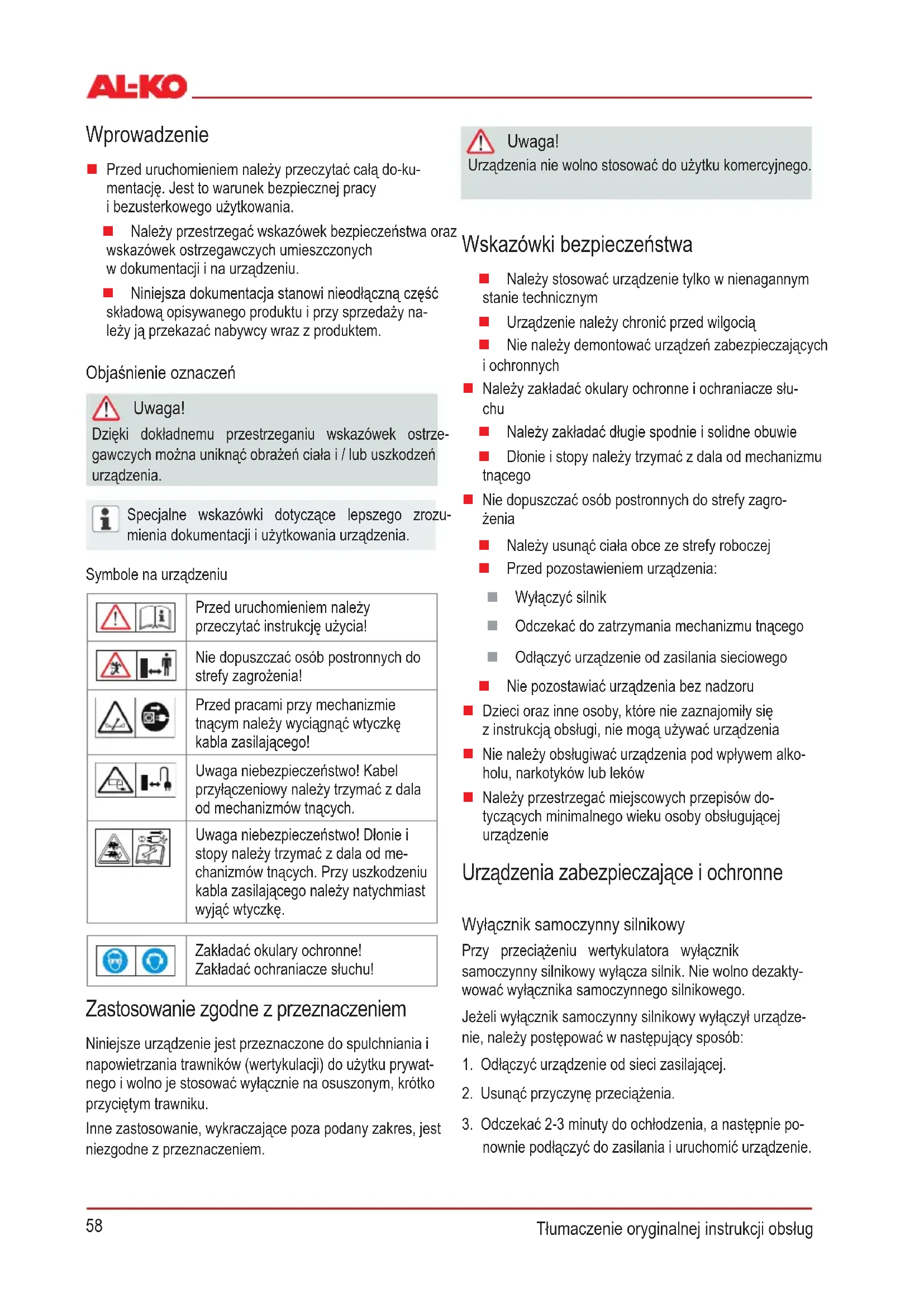 ЕЗ директива 2006/42/EG 2014/30/EU 2000/14/EG 2011/65/EU 2014/35/EU Хармонизоване норме EN 60335-1:2002+A1+A11+A12+A2+A13 EN 13684+A3 EN 60335-2-92 Ниво акустичке снаге измерено / загарантовано EN ISO 3744 98 / 99 dB(A) Процена усклађености 2000/14/EG ДодатакV Kötz,01.07.2016WolfgangHergeth,ManagingDirector58 Tłumaczenie oryginalnej instrukcji obsług Wprowadzenie Przeduruchomieniemnależyprzeczytaćcałądo-ku- mentację.Jesttowarunekbezpiecznejpracy ibezusterkowegoużytkowania. Należyprzestrzegaćwskazówekbezpieczeństwaoraz wskazówekostrzegawczychumieszczonych wdokumentacjiinaurządzeniu. Niniejszadokumentacjastanowinieodłącznączęść składowąopisywanegoproduktuiprzysprzedażyna- leżyjąprzekazaćnabywcywrazzproduktem. Objaśnienieoznaczeń Uwaga! Dzięki dokładnemu przestrzeganiu wskazówek ostrze- gawczychmożnauniknąćobrażeńciałai/lubuszkodzeń urządzenia. Specjalne wskazówki dotyczące lepszego zrozu- mieniadokumentacjiiużytkowaniaurządzenia. Symbolenaurządzeniu Przeduruchomieniemnależy przeczytaćinstrukcjęużycia! Niedopuszczaćosóbpostronnychdo strefyzagrożenia! Przedpracamiprzymechanizmie tnącymnależywyciągnąćwtyczkę kablazasilającego! Uwaganiebezpieczeństwo!Kabel przyłączeniowynależytrzymaćzdala odmechanizmówtnących. Uwaganiebezpieczeństwo!Dłoniei stopynależytrzymaćzdalaodme- chanizmówtnących.Przyuszkodzeniu kablazasilającegonależynatychmiast wyjąćwtyczkę. Zakładaćokularyochronne! Zakładaćochraniaczesłuchu! Zastosowaniezgodnezprzeznaczeniem Niniejszeurządzeniejestprzeznaczonedospulchnianiai napowietrzaniatrawników(wertykulacji)doużytkuprywat- negoiwolnojestosowaćwyłącznienaosuszonym,krótko przyciętymtrawniku. Innezastosowanie,wykraczającepozapodanyzakres,jest niezgodnezprzeznaczeniem. Uwaga! Urządzenianiewolnostosowaćdoużytkukomercyjnego. Wskazówkibezpieczeństwa Należystosowaćurządzenietylkownienagannym stanietechnicznym Urządzenienależychronićprzedwilgocią Nienależydemontowaćurządzeńzabezpieczających i ochronnych Należyzakładaćokularyochronneiochraniaczesłu- chu Należyzakładaćdługiespodnieisolidneobuwie Dłonieistopynależytrzymaćzdalaodmechanizmu tnącego Niedopuszczaćosóbpostronnychdostrefyzagro- żenia Należyusunąćciałaobcezestrefyroboczej Przedpozostawieniemurządzenia: Wyłączyćsilnik Odczekaćdozatrzymaniamechanizmutnącego Odłączyćurządzenieodzasilaniasieciowego Niepozostawiaćurządzeniabeznadzoru Dzieciorazinneosoby,któreniezaznajomiłysię zinstrukcjąobsługi,niemogąużywaćurządzenia Nienależyobsługiwaćurządzeniapodwpływemalko- holu,narkotykówlubleków Należyprzestrzegaćmiejscowychprzepisówdo- tyczącychminimalnegowiekuosobyobsługującej urządzenie Urządzeniazabezpieczająceiochronne Wyłączniksamoczynnysilnikowy Przy przeciążeniu wertykulatora wyłącznik samoczynnysilnikowywyłączasilnik.Niewolnodezakty- wowaćwyłącznikasamoczynnegosilnikowego. Jeżeliwyłączniksamoczynnysilnikowywyłączyłurządze- nie,należypostępowaćwnastępującysposób: