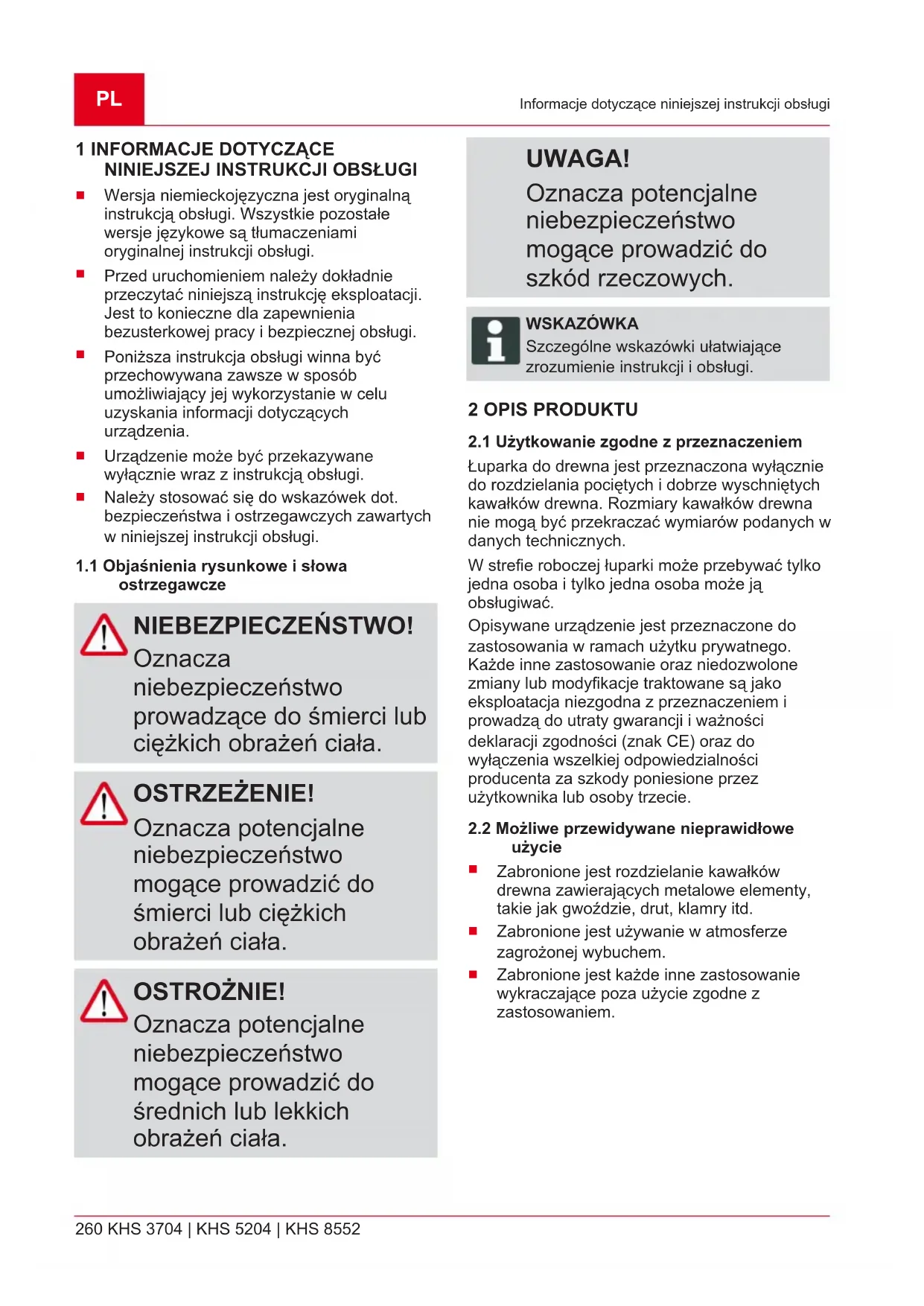 Symbol Znaczenie Przed uruchomieniem przeczytać instrukcję eksploatacji. Nie wpuszczać osób postronnych do obszaru niebezpiecznego. Uwaga, niebezpieczeństwo! Nie zbliżać dłoni do klina rozszczepiającego! Przed rozpoczęciem konserwacji odłączyć urządzenie od sieci zasilania elektrycznego! Symbol Znaczenie Zakładać rękawice ochronne! Nosić obuwie ochronne! Zakładać okulary ochronne!462706_l 263 Zasady bezpieczeństwa Symbol Znaczenie Obsługiwać urządzenie obiema dłońmi! 3 ZASADY BEZPIECZEŃSTWA NIEBEZPIECZEŃSTWO! Nieznajomość zasad bezpieczeństwa może powodować niebezpieczeństwo utraty życia inajcięższych obrażeń. Nieznajomość zasad bezpieczeństwa iinstrukcji obsługi może prowadzić do najcięższych obrażeń, anawet śmierci.