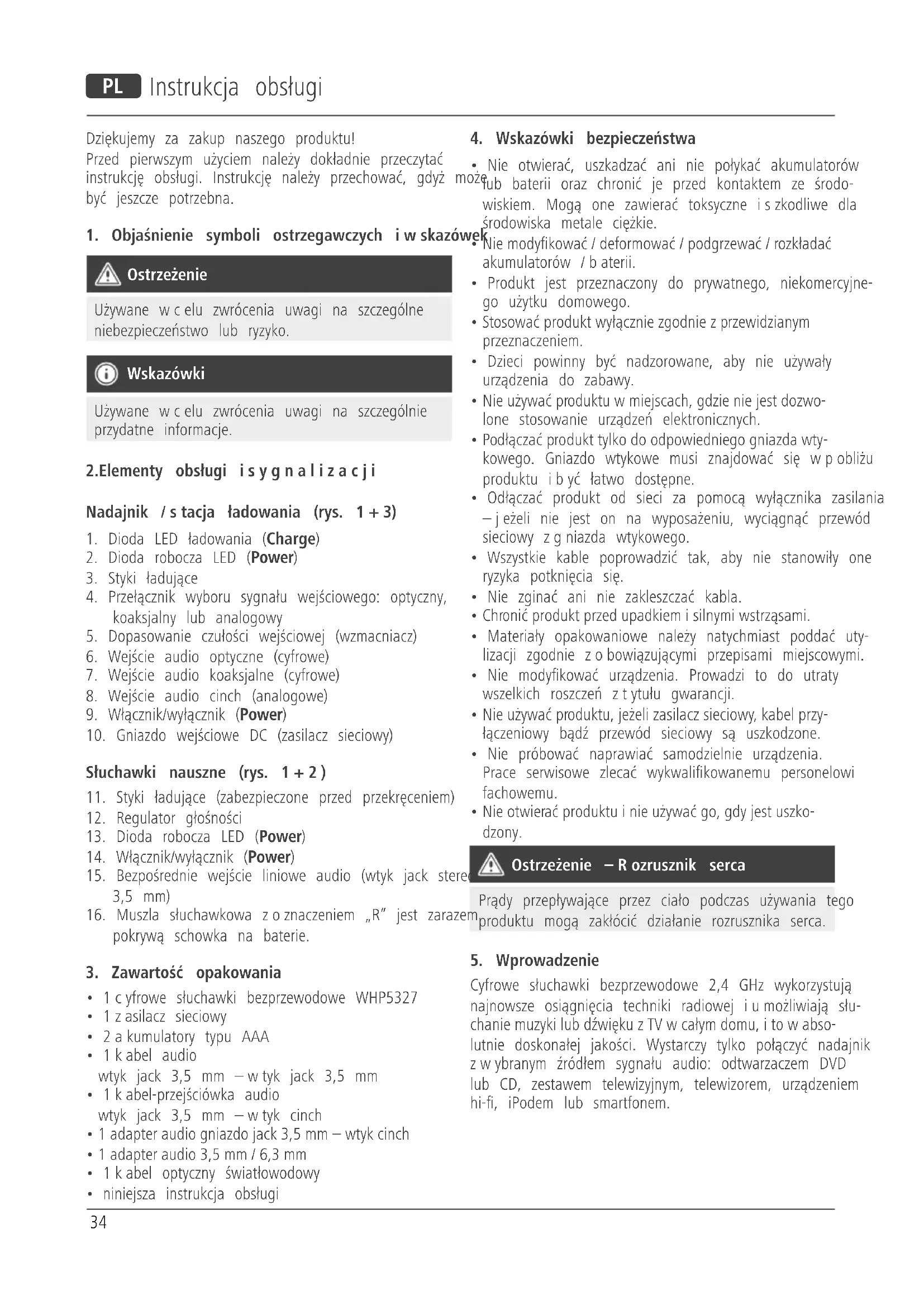 Cyfrowe słuchawki bezprzewodowe 2,4 GHz wykorzystują najnowsze osiągnięcia techniki radiowej iumożliwiają słu- chanie muzyki lub dźwięku zTVwcałym domu, itowabso- lutnie doskonałej jakości. Wystarczy tylko połączyć nadajnik zwybranym źródłem sygnału audio: odtwarzaczem DVD lub CD, zestawem telewizyjnym, telewizorem, urządzeniem hi-, iPodem lub smartfonem.35