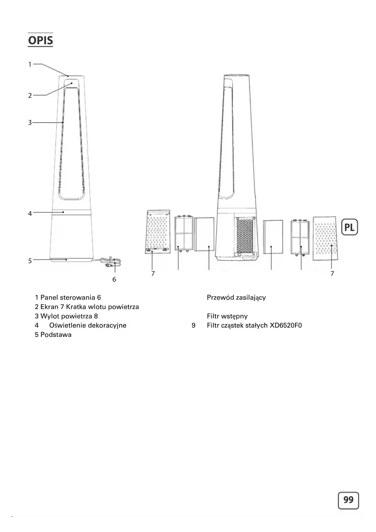 1 Panel sterowania 6 Przewód zasilający 2 Ekran 7 Kratka wlotu powietrza 3 Wylot powietrza 8 Filtr wstępny