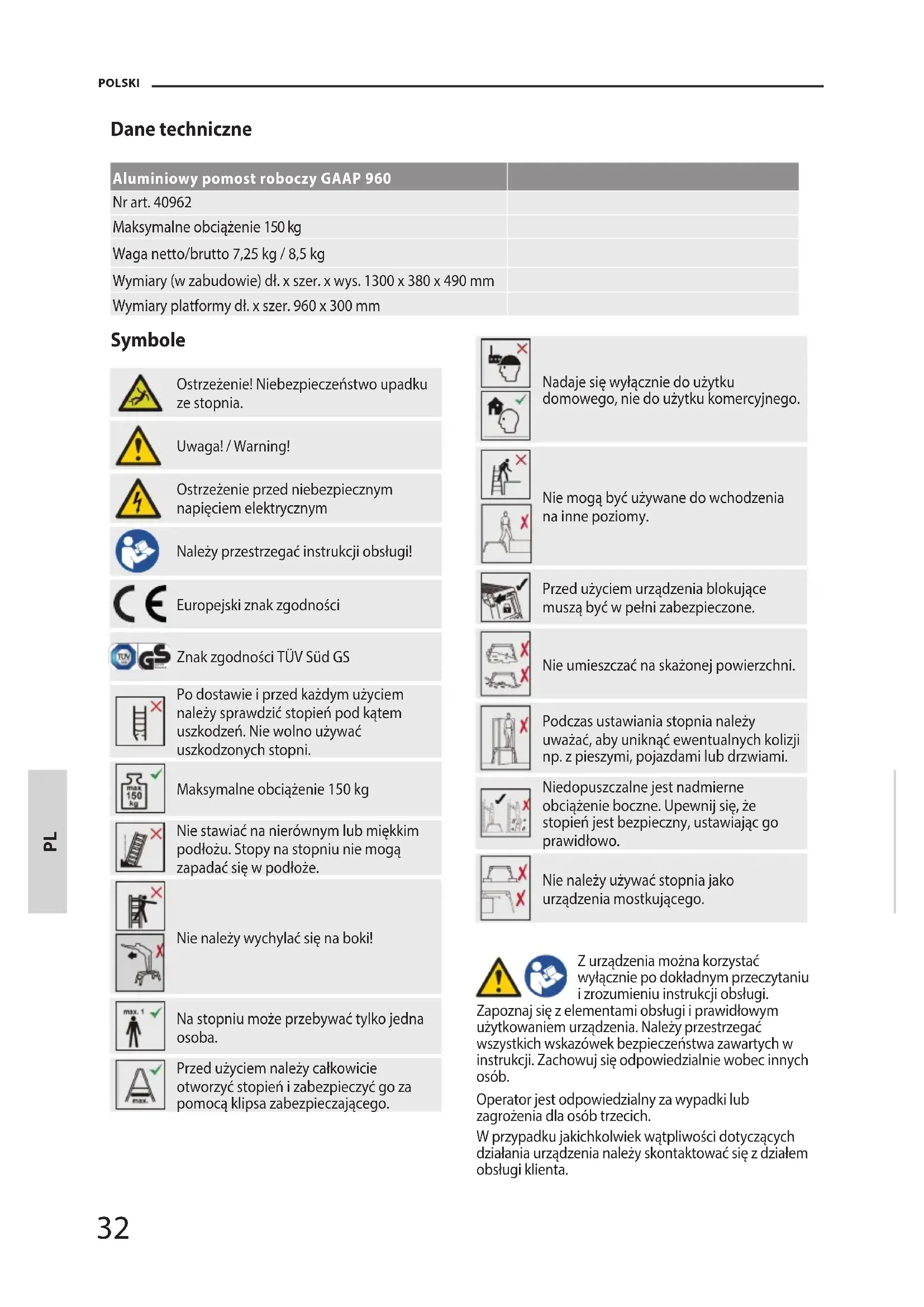 POLSKI Symbole A l u m i n u m W e r k b a n k M L - 2 0 5 Ostrzeżenie! Niebezpieczeństwo upadku ze stopnia. Uwaga! / Warning! Ostrzeżenie przed niebezpiecznym napięciem elektrycznym Należy przestrzegać instrukcji obsługi! Europejski znak zgodności Znak zgodności TÜV Süd GS A l u m i n u m W e r k b a n k M L - 2 0 5 Po dostawie i przed każdym użyciem należy sprawdzić stopień pod kątem uszkodzeń. Nie wolno używać uszkodzonych stopni. A l u m i n u m W e r k b a n k M L - 2 0 5 Maksymalne obciążenie 150 kg A l u m i n u m W e r k b a n k M L - 2 0 5 Nie stawiać na nierównym lub miękkim podłożu. Stopy na stopniu nie mogą zapadać się w podłoże. A l u m i n u m W e r k b a n k M L - 2 0 5 A l u m i nu m W e r kb a n k M L - 2 0 5 Nie należy wychylać się na boki! A l u m i n u m W e r k b a n k M L - 2 0 5 Na stopniu może przebywać tylko jedna osoba. A l u m i n u m W e r k b a n k M L - 2 0 5 Przed użyciem należy całkowicie otworzyć stopień i zabezpieczyć go za pomocą klipsa zabezpieczającego. A l u m i n u m W e r k b a n k M L - 2 0 5 A l u m i n u m W e r k b a n k M L - 2 0 5 Nadaje się wyłącznie do użytku domowego, nie do użytku komercyjnego. A l u m in u m W e rk b a nk M L - 2 05 Nie mogą być używane do wchodzenia na inne poziomy. A l u m i n u m W e r kb a n k M L - 2 0 5 Przed użyciem urządzenia blokujące muszą być w pełni zabezpieczone. A l u m in um We r kb a nk M L - 2 05 Nie umieszczać na skażonej powierzchni. A l u m in um We r kb a nk M L - 2 05 Podczas ustawiania stopnia należy uważać, aby uniknąć ewentualnych kolizji np. z pieszymi, pojazdami lub drzwiami. Al um in um W er k ba nk ML -2 05 Niedopuszczalne jest nadmierne obciążenie boczne. Upewnij się, że stopień jest bezpieczny, ustawiając go prawidłowo. A l u m in um We r kb a nk M L - 2 05 Nie należy używać stopnia jako urządzenia mostkującego. Z urządzenia można korzystać wyłącznie po dokładnym przeczytaniu i zrozumieniu instrukcji obsługi. Zapoznaj się z elementami obsługi i prawidłowym użytkowaniem urządzenia. Należy przestrzegać wszystkich wskazówek bezpieczeństwa zawartych w instrukcji. Zachowuj się odpowiedzialnie wobec innych osób. Operator jest odpowiedzialny za wypadki lub zagrożenia dla osób trzecich. W przypadku jakichkolwiek wątpliwości dotyczących działania urządzenia należy skontaktować się z działem obsługi klienta. Dane techniczne Aluminiowy pomost roboczy GAAP 960 Nr art. 40962 Maksymalne obciążenie 150 kg Waga netto/brutto 7,25 kg / 8,5 kg Wymiary (w zabudowie) dł. x szer. x wys. 1300 x 380 x 490 mm Wymiary platformy dł. x szer. 960 x 300 mm33