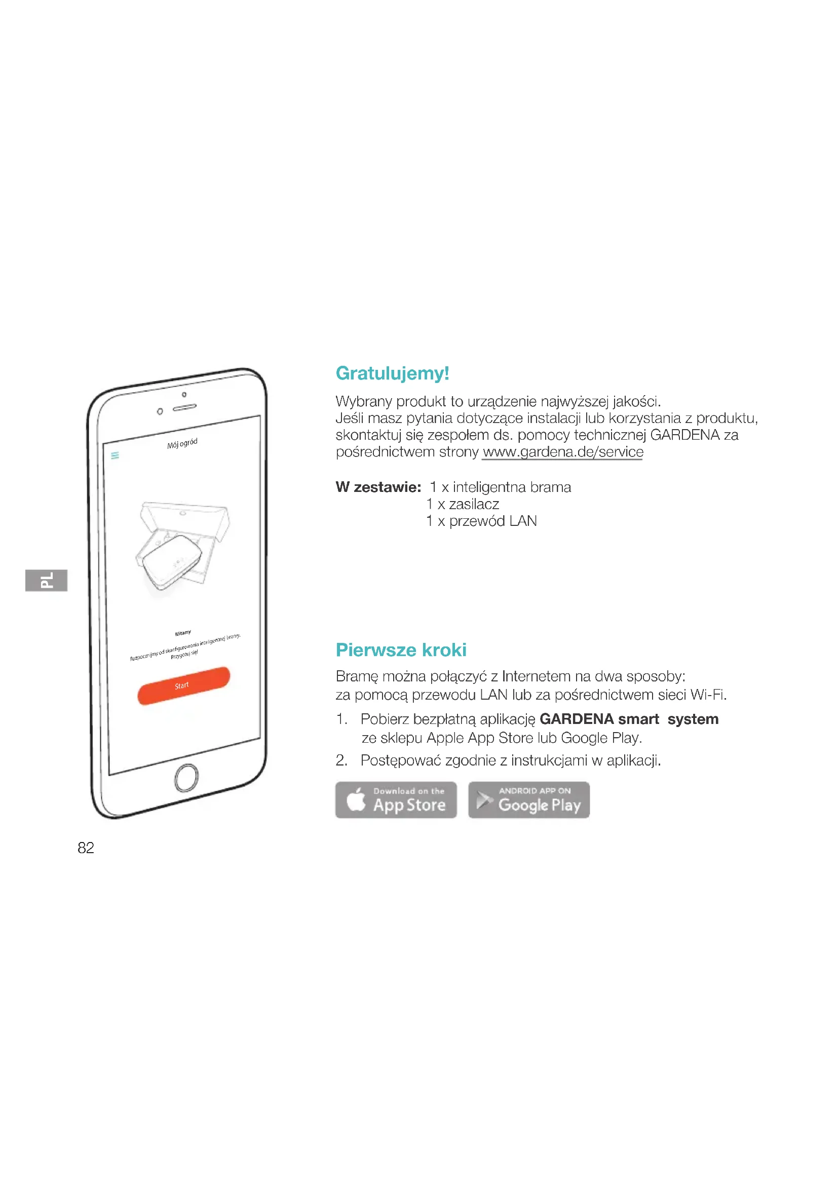 Gratulujemy! Wybrany produkt to urządzenie najwyższej jakości. Jeśli masz pytania dotyczące instalacji lub korzystania z produktu, skontaktuj się zespołem ds. pomocy technicznej GARDENA za pośrednictwem strony www.gardena.de/service W zestawie: 1 x inteligentna brama 1 x zasilacz 1 x przewód LAN Pierwsze kroki Bramę można połączyć z Internetem na dwa sposoby: za pomocą przewodu LAN lub za pośrednictwem sieci Wi-Fi.