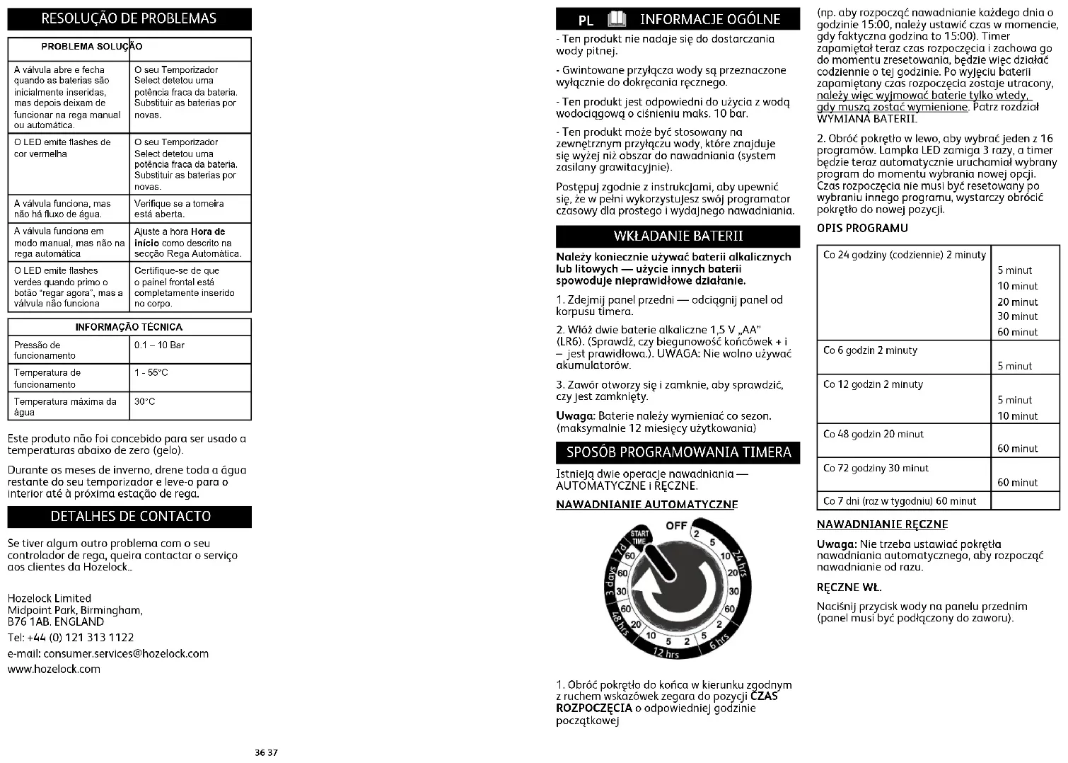 Zawór otwiera się i zamyka, kiedy baterie są włożone po raz pierwszy, ale następnie nie działa podczas nawadniania ręcznego lub automatycznego. Timer wykrył niski poziom naładowania baterii. Wymień baterie na nowe. Lampka LED miga na czerwono. Timer wykrył niski poziom naładowania baterii. Wymień baterie na nowe. Zawór działa, ale woda nie przepływa. Sprawdź, czy kurek jest otwarty. Zawór działa w trybie ręcznym, ale nie przy nawadnianiu automatycznym. Ustaw Czas początkowy zgodnie z opisem w rozdziale dotyczącym nawadniania automatycznego.. Lampka LED miga na zielono po naciśnięciu przycisku nawadniania, ale zawór nie działa. Upewnij się, że panel przedni jest całkowicie włożony w korpus urządzenia DANE TECHNICZNE Ciśnienie robocze 0.1 – 10 bar Temperatura robocza 1 – 55°C Maksymalna temperatura wody 30°C Produkt nie jest przeznaczony do wykorzystania w temperaturze poniżej zera (podczas mrozu). W miesiącach zimowych należy spuścić pozostałą wodę z timera i umieścić urządzenie w pomieszczeniu zadaszonym aż do następnego sezonu nawadniania. DANE KONTAKTOWE W razie jakichkolwiek problemów dotyczących sterownika wody należy skontaktować się z działem obsługi klienta firmy Hozelock. Hozelock Limited Midpoint Park, Birmingham,