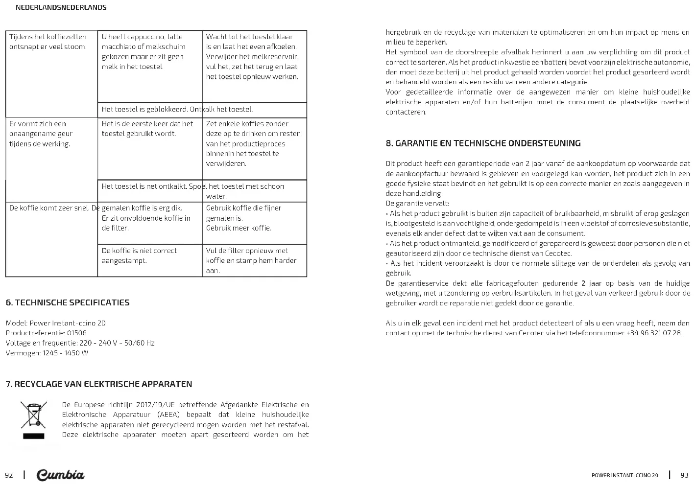 - Odnosi się do przypadków, spowodowanych normalnym zużywaniem się elementów w trakcie ich użytkowania. Gwarancja obejmuje wszystkie wady fabryczne produktu przez 2 lata od daty zakupu, nie włączając w to części podlegających zużyciu. Urządzenie nie było używane przez użytkownika w odpowiedni sposób. W przypadku wykrycia ewentualnego defektu urządzenia lub w razie potrzeby konsultacji skontaktuj się z Serwisem Obsługi Technicznej Cecotec pod numerem +34 96 321 07 28.POWER INSTANT-CCINO 20