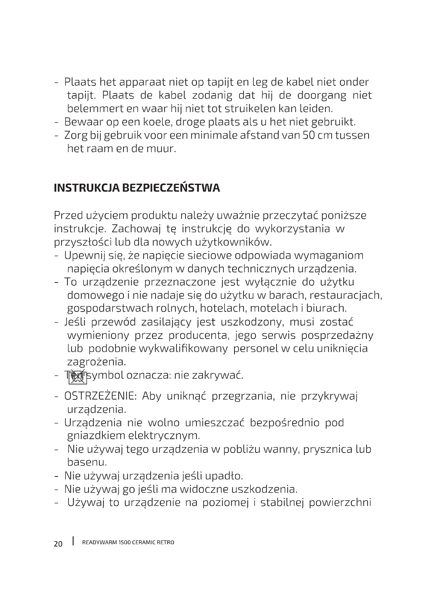 Przed użyciem produktu należy uważnie przeczytać poniższe instrukcje. Zachowaj tę instrukcję do wykorzystania w przyszłości lub dla nowych użytkowników. - Upewnij się, że napięcie sieciowe odpowiada wymaganiom napięcia określonym w danych technicznych urządzenia. - To urządzenie przeznaczone jest wyłącznie do użytku domowego i nie nadaje się do użytku w barach, restauracjach, gospodarstwach rolnych, hotelach, motelach i biurach. - Jeśli przewód zasilający jest uszkodzony, musi zostać wymieniony przez producenta, jego serwis posprzedażny lub podobnie wykwalikowany personel w celu uniknięcia zagrożenia. - Ten symbol oznacza: nie zakrywać. - OSTRZEŻENIE: Aby uniknąć przegrzania, nie przykrywaj urządzenia. - Urządzenia nie wolno umieszczać bezpośrednio pod gniazdkiem elektrycznym. - Nie używaj tego urządzenia w pobliżu wanny, prysznica lub basenu. - Nie używaj urządzenia jeśli upadło. - Nie używaj go jeśli ma widoczne uszkodzenia. - Używaj to urządzenie na poziomej i stabilnej powierzchniREADYWARM 1500 CERAMIC RETRO