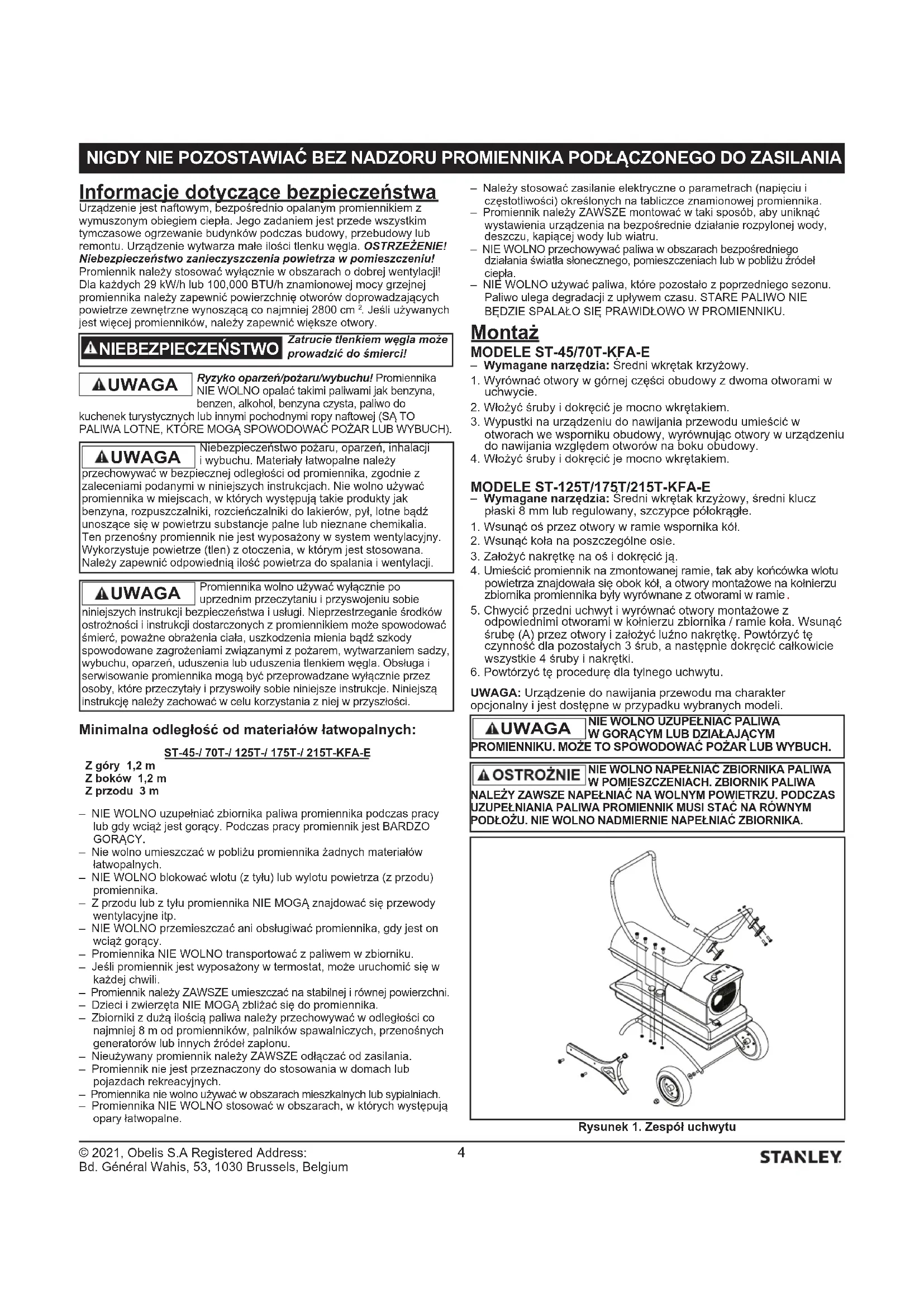 © 2021, Obelis S.A Registered Address: Bd. Général Wahis, 53, 1030 Brussels, Belgium Informacje dotyczące bezpieczeństwa Urządzenie jest naftowym, bezpośrednio opalanym promiennikiem z wymuszonym obiegiem ciepła. Jego zadaniem jest przede wszystkim tymczasowe ogrzewanie budynków podczas budowy, przebudowy lub remontu. Urządzenie wytwarza małe ilości tlenku węgla. OSTRZEŻENIE! Niebezpieczeństwo zanieczyszczenia powietrza w pomieszczeniu! Promiennik należy stosować wyłącznie w obszarach o dobrej wentylacji! Dla każdych 29 kW/h lub 100,000 BTU/h znamionowej mocy grzejnej promiennika należy zapewnić powierzchnię otworów doprowadzających powietrze zewnętrzne wynoszącą co najmniej 2800 cm . Jeśli używanych jest więcej promienników, należy zapewnić większe otwory.Ryzyko oparzeń/pożaru/wybuchu! Promiennika NIE WOLNO opalać takimi paliwami jak benzyna, benzen, alkohol, benzyna czysta, paliwo do kuchenek turystycznych lub innymi pochodnymi ropy naftowej (SĄ TO PALIWA LOTNE, KTÓRE MOGĄ SPOWODOWAĆ POŻAR LUB WYBUCH). Minimalna odległość od materiałów łatwopalnych: ST-45-/ 70T-/ 125T-/ 175T-/ 215T-KFA-E Z góry 1,2 m Z boków 1,2 m Z przodu 3 m– NIE WOLNO uzupełniać zbiornika paliwa promiennika podczas pracy lub gdy wciąż jest gorący. Podczas pracy promiennik jest BARDZO GORĄCY.– Nie wolno umieszczać w pobliżu promiennika żadnych materiałów łatwopalnych.– NIE WOLNO blokować wlotu (z tyłu) lub wylotu powietrza (z przodu) promiennika.– Z przodu lub z tyłu promiennika NIE MOGĄ znajdować się przewody wentylacyjne itp.– NIE WOLNO przemieszczać ani obsługiwać promiennika, gdy jest on wciąż gorący.– Promiennika NIE WOLNO transportować z paliwem w zbiorniku.– Jeśli promiennik jest wyposażony w termostat, może uruchomić się w każdej chwili.– Promiennik należy ZAWSZE umieszczać na stabilnej i równej powierzchni.– Dzieci i zwierzęta NIE MOGĄ zbliżać się do promiennika.– Zbiorniki z dużą ilością paliwa należy przechowywać w odległości co najmniej 8 m od promienników, palników spawalniczych, przenośnych generatorów lub innych źródeł zapłonu.– Nieużywany promiennik należy ZAWSZE odłączać od zasilania.– Promiennik nie jest przeznaczony do stosowania w domach lub pojazdach rekreacyjnych.– Promiennika nie wolno używać w obszarach mieszkalnych lub sypialniach.– Promiennika NIE WOLNO stosować w obszarach, w których występują opary łatwopalne.– Należy stosować zasilanie elektryczne o parametrach (napięciu i częstotliwości) określonych na tabliczce znamionowej promiennika.– Promiennik należy ZAWSZE montować w taki sposób, aby uniknąć wystawienia urządzenia na bezpośrednie działanie rozpylonej wody, deszczu, kapiącej wody lub wiatru.– NIE WOLNO przechowywać paliwa w obszarach bezpośredniego działania światła słonecznego, pomieszczeniach lub w pobliżu źródeł ciepła.– NIE WOLNO używać paliwa, które pozostało z poprzedniego sezonu. Paliwo ulega degradacji z upływem czasu. STARE PALIWO NIE BĘDZIE SPALAŁO SIĘ PRAWIDŁOWO W PROMIENNIKU. Montaż