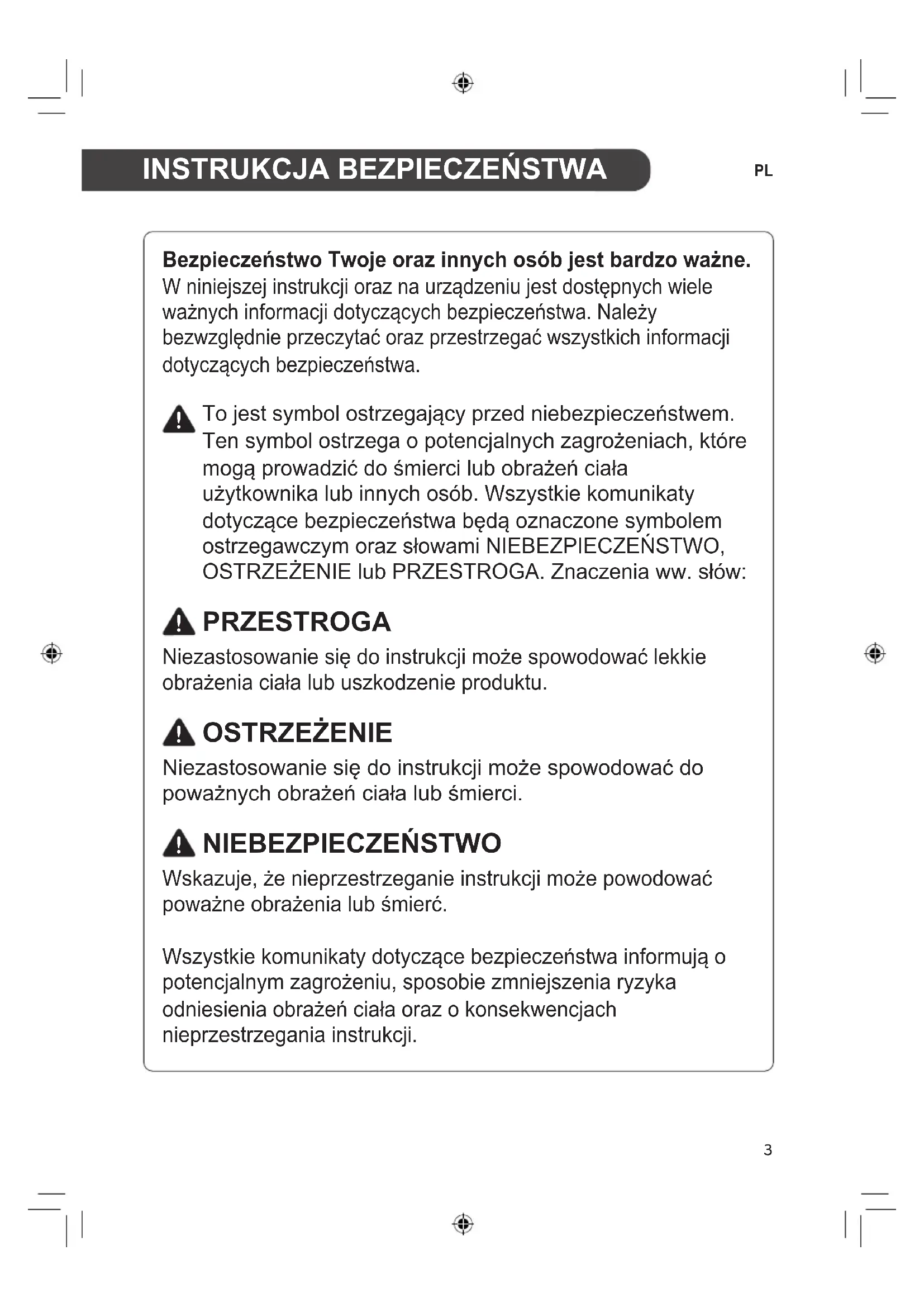 Bezpieczeństwo Twoje oraz innych osób jest bardzo ważne. W niniejszej instrukcji oraz na urządzeniu jest dostępnych wiele ważnych informacji dotyczących bezpieczeństwa. Należy bezwzględnie przeczytać oraz przestrzegać wszystkich informacji dotyczących bezpieczeństwa. To jest symbol ostrzegający przed niebezpieczeństwem. Ten symbol ostrzega o potencjalnych zagrożeniach, które mogą prowadzić do śmierci lub obrażeń ciała użytkownika lub innych osób. Wszystkie komunikaty dotyczące bezpieczeństwa będą oznaczone symbolem ostrzegawczym oraz słowami NIEBEZPIECZEŃSTWO, OSTRZEŻENIE lub PRZESTROGA. Znaczenia ww. słów: PRZESTROGA Niezastosowanie się do instrukcji może spowodować lekkie obrażenia ciała lub uszkodzenie produktu. OSTRZEŻENIE Niezastosowanie się do instrukcji może spowodować do poważnych obrażeń ciała lub śmierci. NIEBEZPIECZEŃSTWO Wskazuje, że nieprzestrzeganie instrukcji może powodować poważne obrażenia lub śmierć. Wszystkie komunikaty dotyczące bezpieczeństwa informują o potencjalnym zagrożeniu, sposobie zmniejszenia ryzyka odniesienia obrażeń ciała oraz o konsekwencjach nieprzestrzegania instrukcji.
