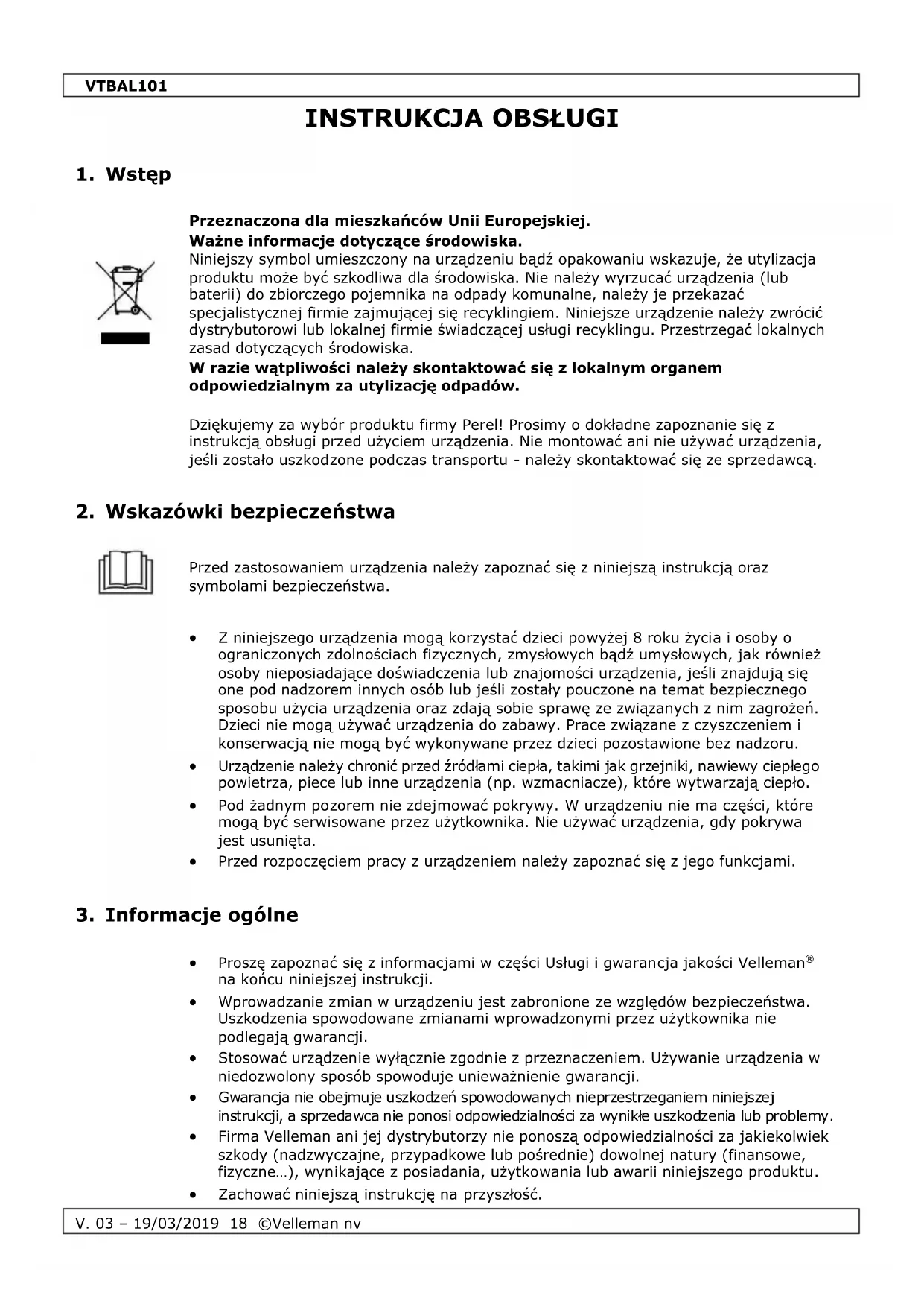 Właścicielem praw autorskich do niniejszej instrukcji jest firma Velleman nv. Wszelkie prawa są zastrzeżone na całym świecie. Żadna część niniejszej instrukcji nie może być kopiowana, powielana, tłumaczona ani przenoszona na jakikolwiek nośnik elektroniczny (lub w inny sposób) bez wcześniejszej pisemnej zgody właściciela praw autorskich.VTBAL101