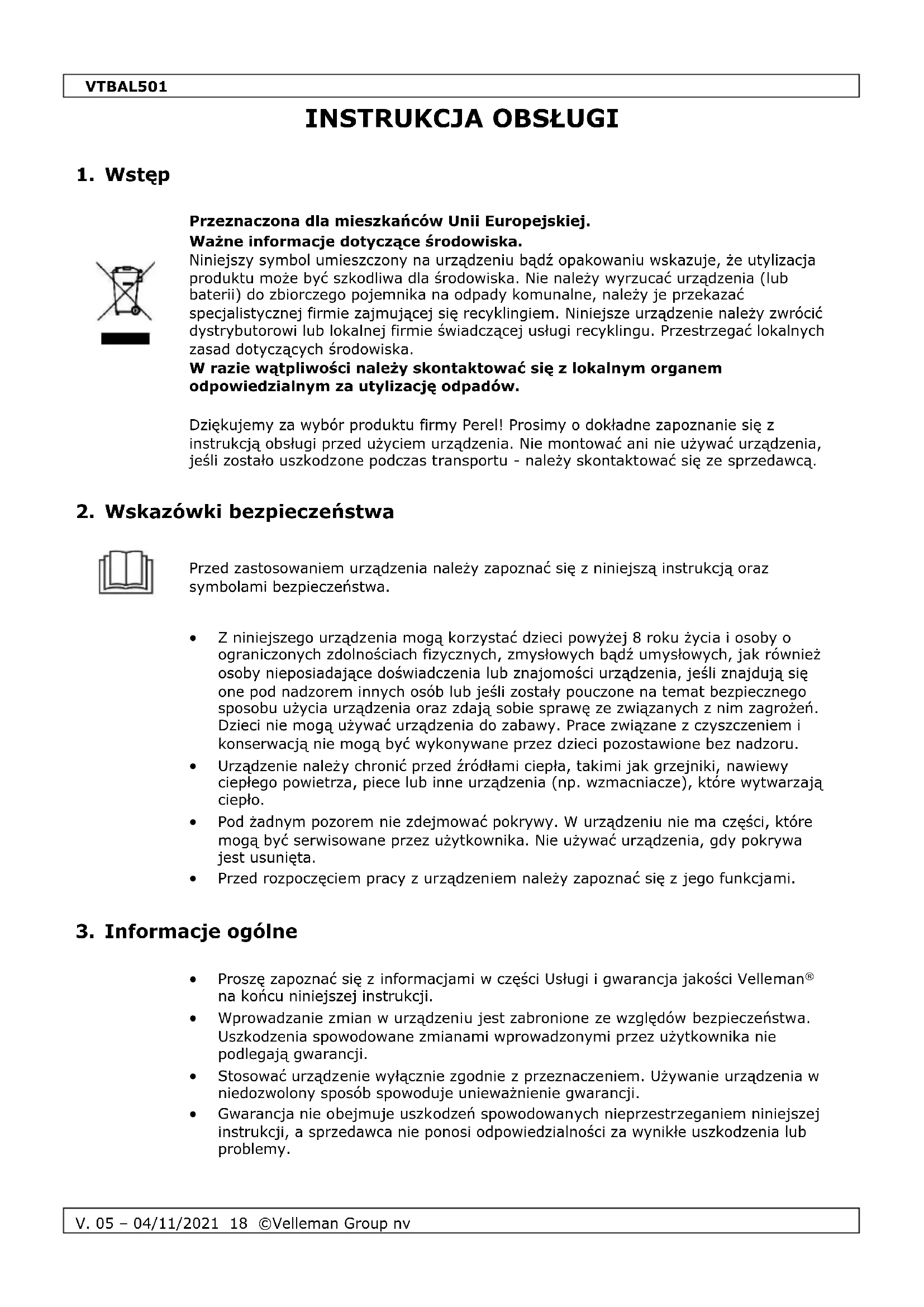 - Gwarancja nie obejmuje uszkodzeń spowodowanych nieprzestrzeganiem niniejszej instrukcji, a sprzedawca nie ponosi odpowiedzialności za wynikłe uszkodzenia lub problemy.VTBAL501