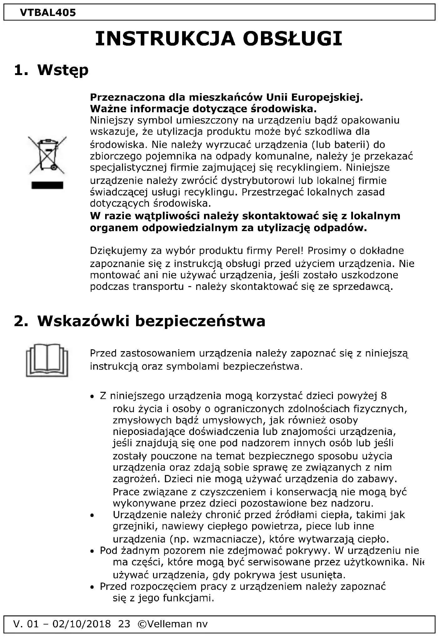 Znajdź bezpłatnie instrukcję urządzenia VTBAL405 Perel w formacie PDF.