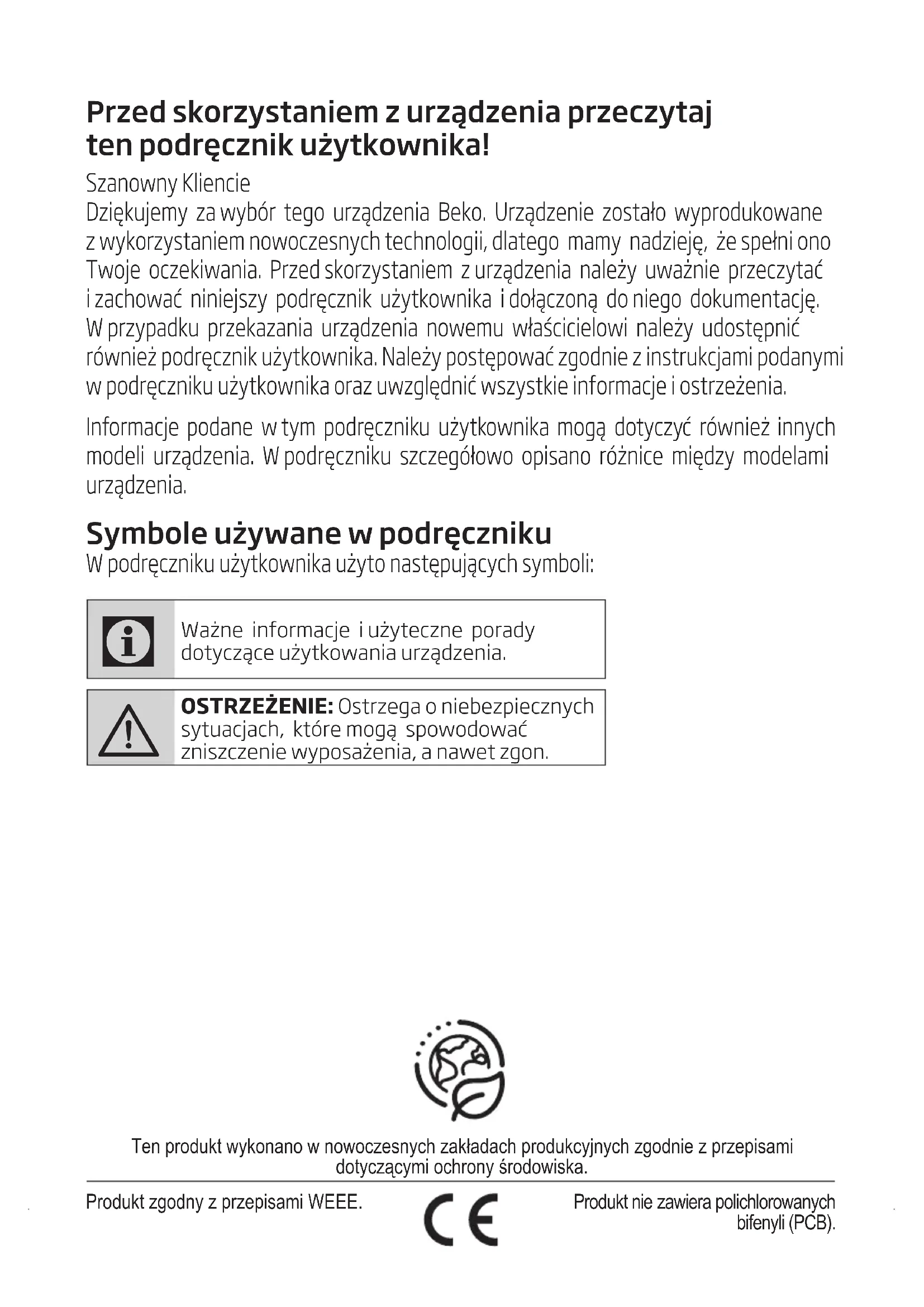 Technische gegevens Manufacturer: Zhuhai RHEIN Electronic Technology Co.,Ltd Address: Rm 410-411 Bldg 20th No.1889 East Huandao Rd, Hengqin New District, Zhuhai, Guangdong China 519000 Importer: Arcelik A.S. Address: Arcelik A.S. Karaagac Cd. No:2-6 34445 Sutluce, Beyoglu, Istanbul, TurkeyPrzed skorzystaniem z urządzenia przeczytaj ten podręcznik użytkownika! Szanowny Kliencie Dziękujemy za wybór tego urządzenia Beko. Urządzenie zostało wyprodukowane z wykorzystaniem nowoczesnych technologii, dlatego mamy nadzieję, że spełni ono Twoje oczekiwania. Przed skorzystaniem z urządzenia należy uważnie przeczytać i zachować niniejszy podręcznik użytkownika i dołączoną do niego dokumentację. W przypadku przekazania urządzenia nowemu właścicielowi należy udostępnić również podręcznik użytkownika. Należy postępować zgodnie z instrukcjami podanymi w podręczniku użytkownika oraz uwzględnić wszystkie informacje i ostrzeżenia. Informacje podane w tym podręczniku użytkownika mogą dotyczyć również innych modeli urządzenia. W podręczniku szczegółowo opisano różnice między modelami urządzenia. Symbole używane w podręczniku W podręczniku użytkownika użyto następujących symboli: