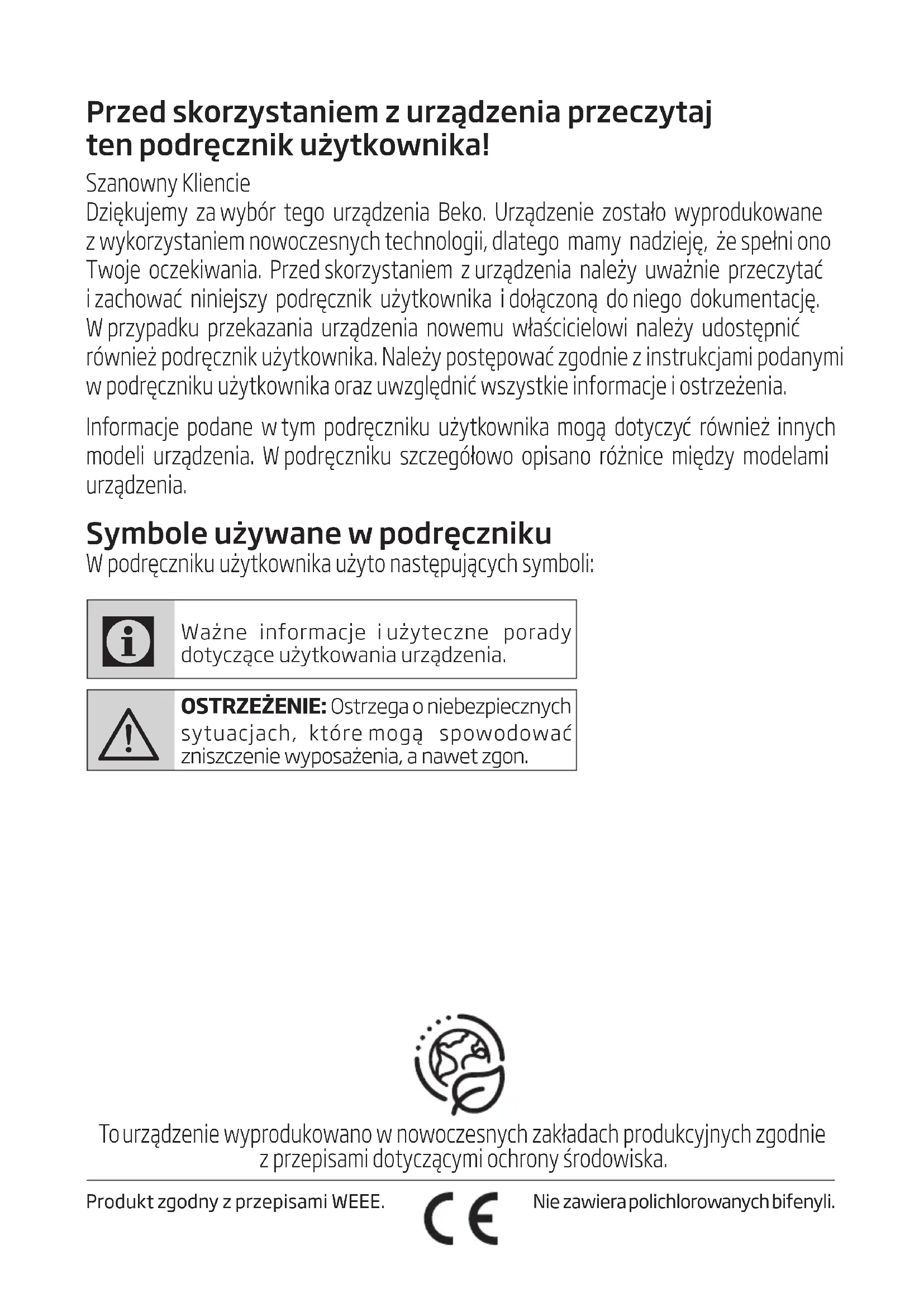 Technische gegevens Manufacturer: Zhuhai RHEIN Electronic Technology Co.,Ltd Address: Rm 410-411 Bldg 20th No.1889 East Huandao Rd, Hengqin New District, Zhuhai, Guangdong China 519000 Importer: Arcelik A.S. Address: Arcelik A.S. Karaagac Cd. No:2-6 34445 Sutluce, Beyoglu, Istanbul, Turkey SDA-HVAC-01-21-06Przed skorzystaniem z urządzenia przeczytaj ten podręcznik użytkownika! Szanowny Kliencie Dziękujemy za wybór tego urządzenia Beko. Urządzenie zostało wyprodukowane z wykorzystaniem nowoczesnych technologii, dlatego mamy nadzieję, że spełni ono Twoje oczekiwania. Przed skorzystaniem z urządzenia należy uważnie przeczytać i zachować niniejszy podręcznik użytkownika i dołączoną do niego dokumentację. W przypadku przekazania urządzenia nowemu właścicielowi należy udostępnić również podręcznik użytkownika. Należy postępować zgodnie z instrukcjami podanymi w podręczniku użytkownika oraz uwzględnić wszystkie informacje i ostrzeżenia. Informacje podane w tym podręczniku użytkownika mogą dotyczyć również innych modeli urządzenia. W podręczniku szczegółowo opisano różnice między modelami urządzenia. Symbole używane w podręczniku W podręczniku użytkownika użyto następujących symboli: