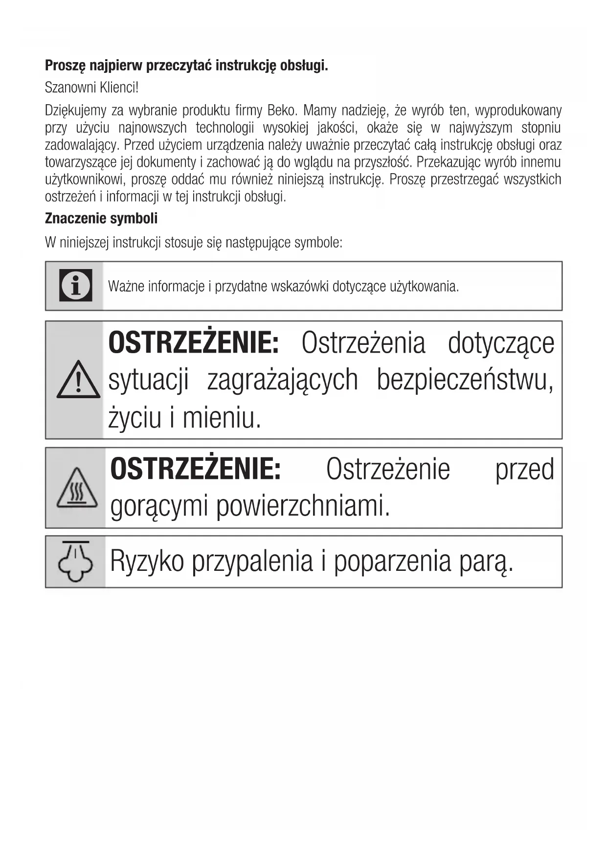 El garante e importador de su electrodoméstico es: BEKO SPAIN ELECTRONICS, S.L. Calle Provenza nº 388 3º Barcelona 08025, España. Conózcanos mejor en nuestra página: www.beko.com Conserve este documento, es importante para usted. (*) Se consideran electrodomésticos de gama blanca, los aparatos de gran tamaño de cocina, limpieza, refrigeración y ventilación y el pequeño aparato electrodoméstico (PAE) aquellos aparatos de higiene personal, mantenimiento del hogar y preparación de alimentos.Proszę najpierw przeczytać instrukcję obsługi. Szanowni Klienci! Dziękujemy za wybranie produktu firmy Beko. Mamy nadzieję, że wyrób ten, wyprodukowany przy użyciu najnowszych technologii wysokiej jakości, okaże się w najwyższym stopniu zadowalający. Przed użyciem urządzenia należy uważnie przeczytać całą instrukcję obsługi oraz towarzyszące jej dokumenty i zachować ją do wglądu na przyszłość. Przekazując wyrób innemu użytkownikowi, proszę oddać mu również niniejszą instrukcję. Proszę przestrzegać wszystkich ostrzeżeń i informacji w tej instrukcji obsługi. Znaczenie symboli W niniejszej instrukcji stosuje się następujące symbole: