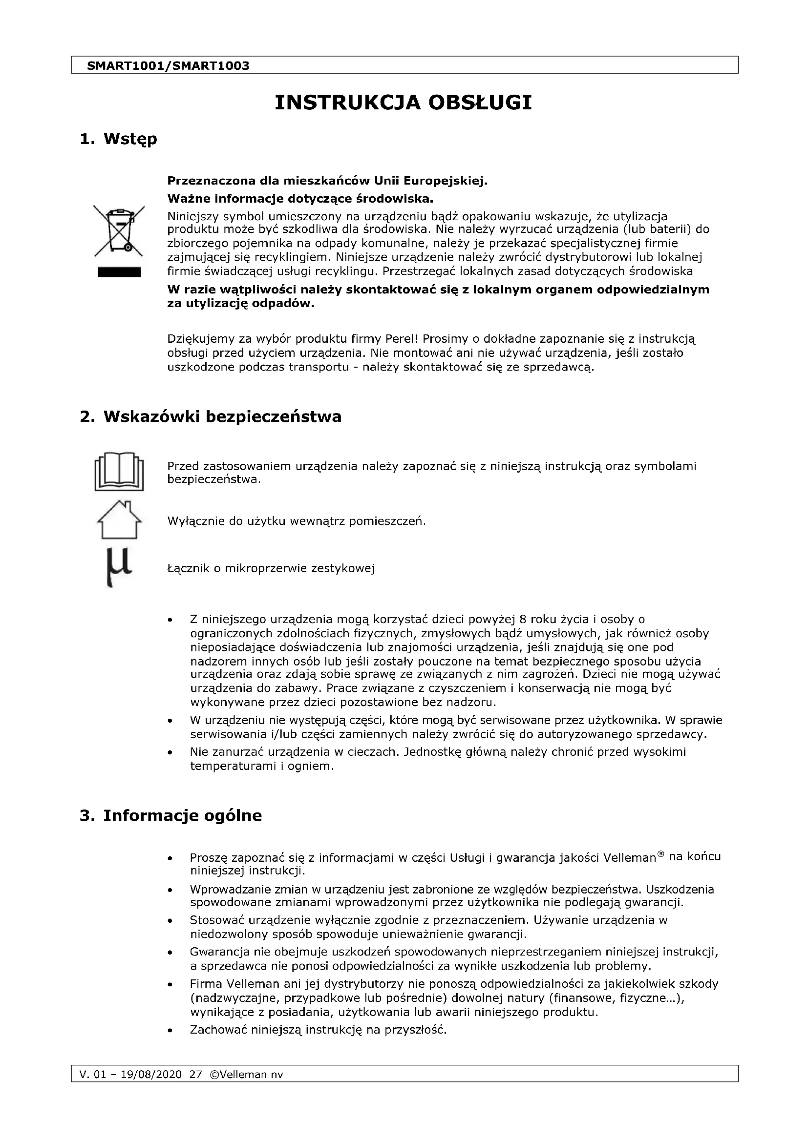 Właścicielem praw autorskich do niniejszej instrukcji jest firma Velleman nv. Wszelkie prawa są zastrzeżone na całym świecie. Żadna część niniejszej instrukcji nie może być kopiowana, powielana, tłumaczona ani przenoszona na jakikolwiek nośnik elektroniczny (lub w inny sposób) bez wcześniejszej pisemnej zgody właściciela praw autorskich.SMART1001/SMART1003