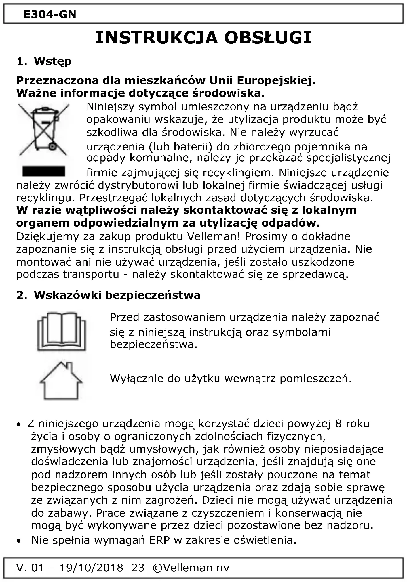 Przeznaczona dla mieszkańców Unii Europejskiej. Ważne informacje dotyczące środowiska. Niniejszy symbol umieszczony na urządzeniu bądź opakowaniu wskazuje, że utylizacja produktu może być szkodliwa dla środowiska. Nie należy wyrzucać urządzenia (lub baterii) do zbiorczego pojemnika na odpady komunalne, należy je przekazać specjalistycznej firmie zajmującej się recyklingiem. Niniejsze urządzenie należy zwrócić dystrybutorowi lub lokalnej firmie świadczącej usługi recyklingu. Przestrzegać lokalnych zasad dotyczących środowiska. W razie wątpliwości należy skontaktować się z lokalnym organem odpowiedzialnym za utylizację odpadów. Dziękujemy za zakup produktu Velleman! Prosimy o dokładne zapoznanie się z instrukcją obsługi przed użyciem urządzenia. Nie montować ani nie używać urządzenia, jeśli zostało uszkodzone podczas transportu - należy skontaktować się ze sprzedawcą.