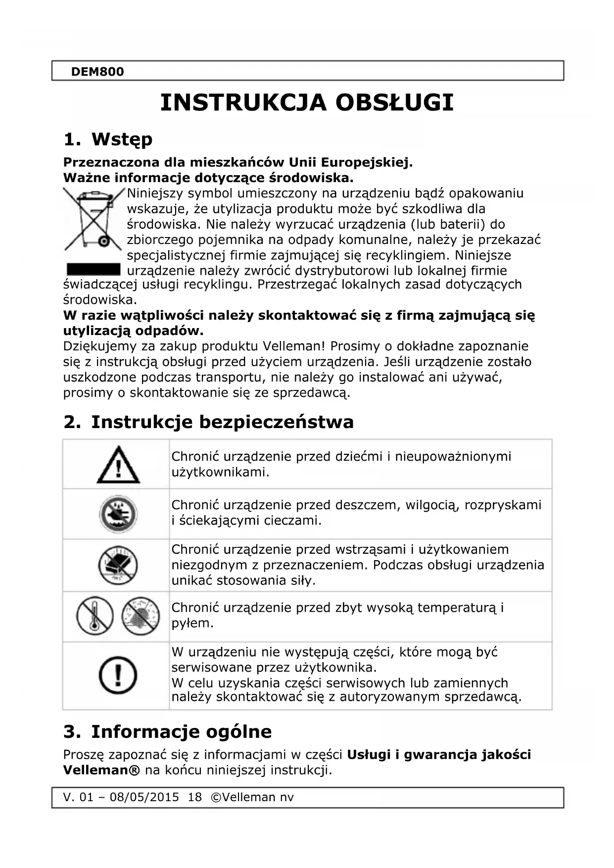 Proszę zapoznać się z informacjami w części Usługi i gwarancja jakości Velleman® na końcu niniejszej instrukcji.DEM800