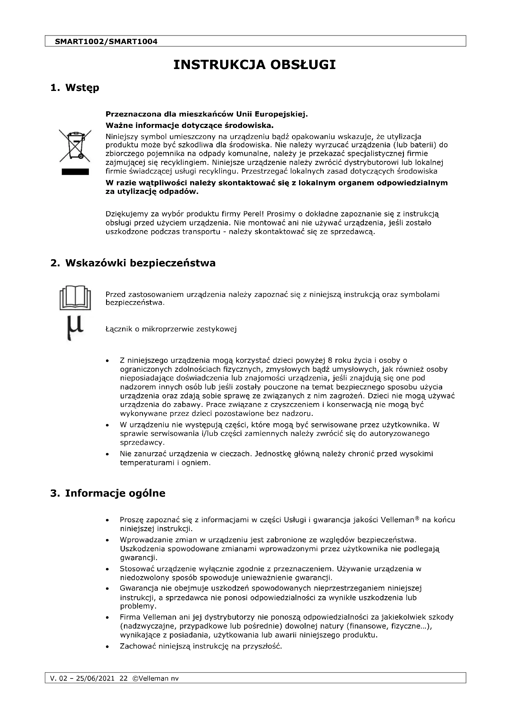 Właścicielem praw autorskich do niniejszej instrukcji jest firma Velleman nv. Wszelkie prawa są zastrzeżone na całym świecie. Żadna część niniejszej instrukcji nie może być kopiowana, powielana, tłumaczona ani przenoszona na jakikolwiek nośnik elektroniczny (lub w inny sposób) bez wcześniejszej pisemnej zgody właściciela praw autorskich.SMART1002/SMART1004