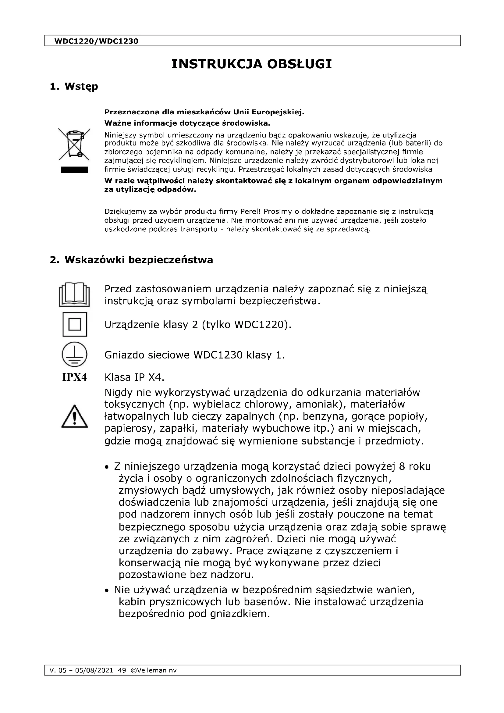 Właścicielem praw autorskich do niniejszej instrukcji jest firma Velleman nv. Wszelkie prawa są zastrzeżone na całym świecie. Żadna część niniejszej instrukcji nie może być kopiowana, powielana, tłumaczona ani przenoszona na jakikolwiek nośnik elektroniczny (lub w inny sposób) bez wcześniejszej pisemnej zgody właściciela praw autorskich.WDC1220/WDC1230