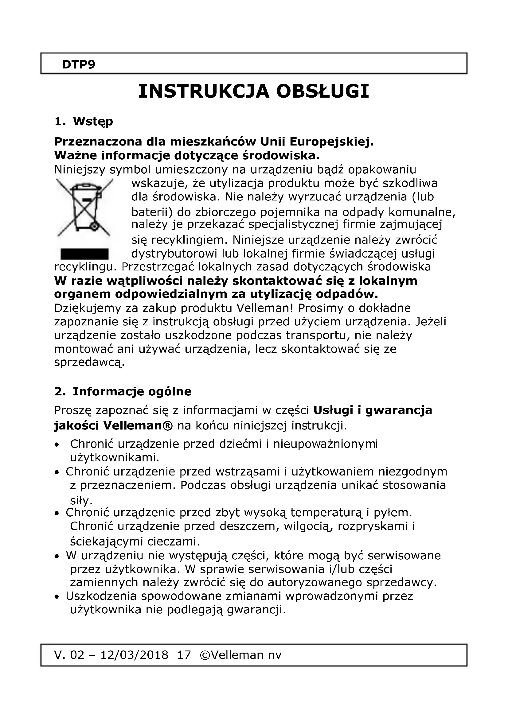 Proszę zapoznać się z informacjami w części Usługi i gwarancja jakości Velleman® na końcu niniejszej instrukcji. Chronić urządzenie przed dziećmi i nieupoważnionymi użytkownikami. Chronić urządzenie przed wstrząsami i użytkowaniem niezgodnym z przeznaczeniem. Podczas obsługi urządzenia unikać stosowania siły. Chronić urządzenie przed zbyt wysoką temperaturą i pyłem. Chronić urządzenie przed deszczem, wilgocią, rozpryskami i ściekającymi cieczami. W urządzeniu nie występują części, które mogą być serwisowane przez użytkownika. W sprawie serwisowania i/lub części zamiennych należy zwrócić się do autoryzowanego sprzedawcy. Uszkodzenia spowodowane zmianami wprowadzonymi przez użytkownika nie podlegają gwarancji.DTP9