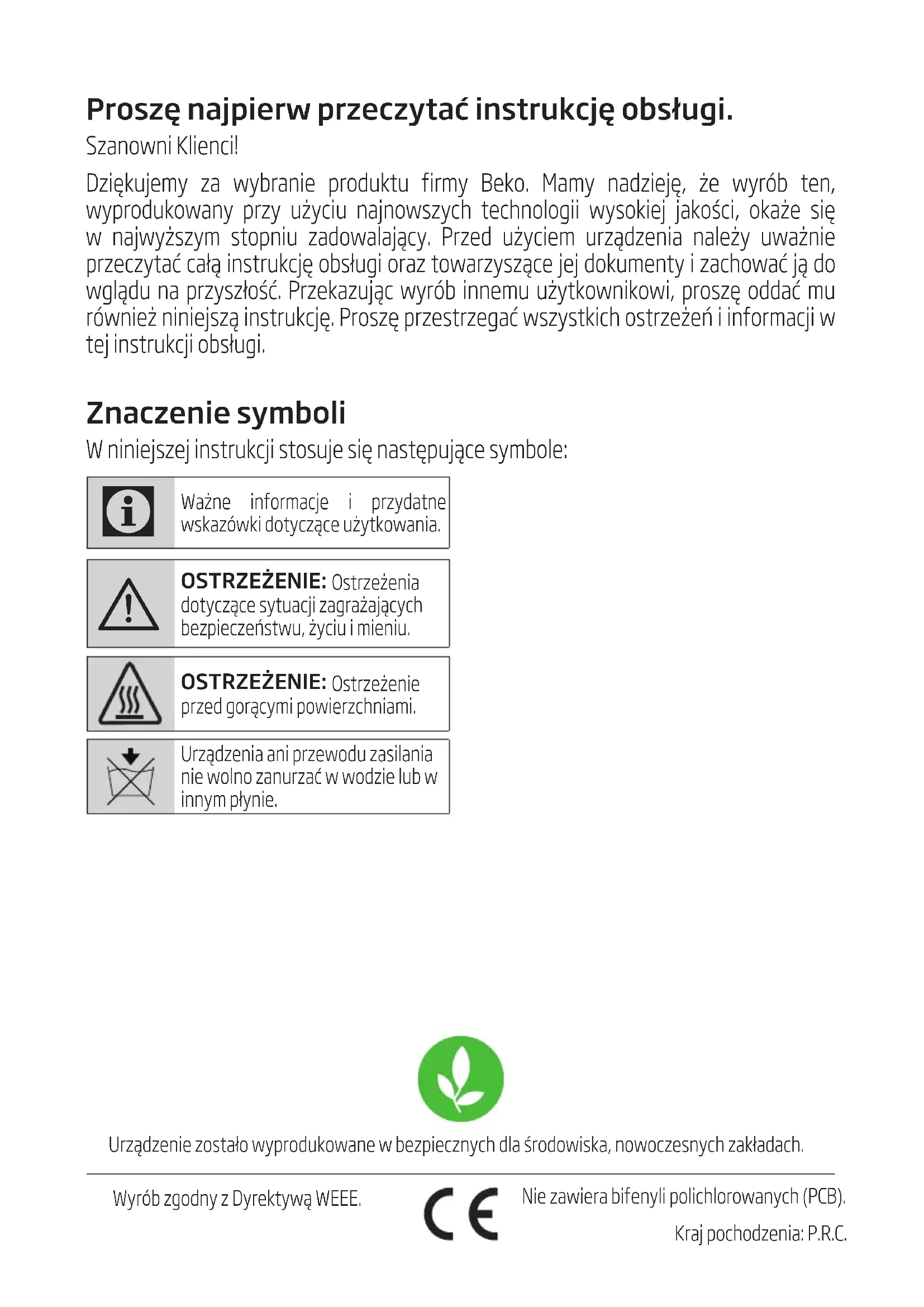 Proszę najpierw przeczytać instrukcję obsługi. Szanown Klenc! Dzękujemy za wybrane produktu frmy Beko. Mamy nadzeję, że wyrób ten, wyprodukowany przy użycu najnowszych technolog wysokej jakośc, okaże sę w najwyższym stopnu zadowalający. Przed użycem urządzena należy uważne przeczytać całą nstrukcję obsług oraz towarzyszące jej dokumenty zachować ją do wglądu na przyszłość. Przekazując wyrób nnemu użytkownkow, proszę oddać mu równeż nnejszą nstrukcję. Proszę przestrzegać wszystkch ostrzeżeń nformacj w tej nstrukcj obsług. Znaczenie symboli W nnejszej nstrukcj stosuje sę następujące symbole: