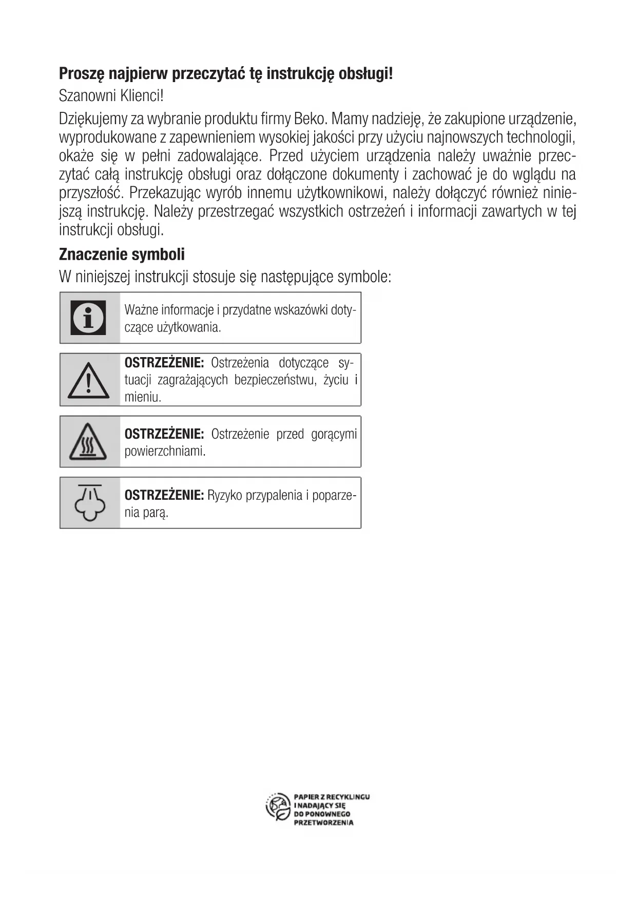 OSTRZEŻENIE: Ostrzeżenia dotyczące sy- tuacji zagrażających bezpieczeństwu, życiu i mieniu. OSTRZEŻENIE: Ostrzeżenie przed gorącymi powierzchniami. OSTRZEŻENIE: Ryzyko przypalenia i poparze- nia parą.1 Ważne instrukcje dotyczące bezpieczeństwa i ochrony środowiska Rozdział ten zawiera instrukcje dotyczące bezpieczeństwa, które pomogą uniknąć obrażeń ciała lub uszkodzeń mienia. Nieprzestrzeganie tych instrukcji spowoduje unieważnienie udzie- lonej gwarancji.