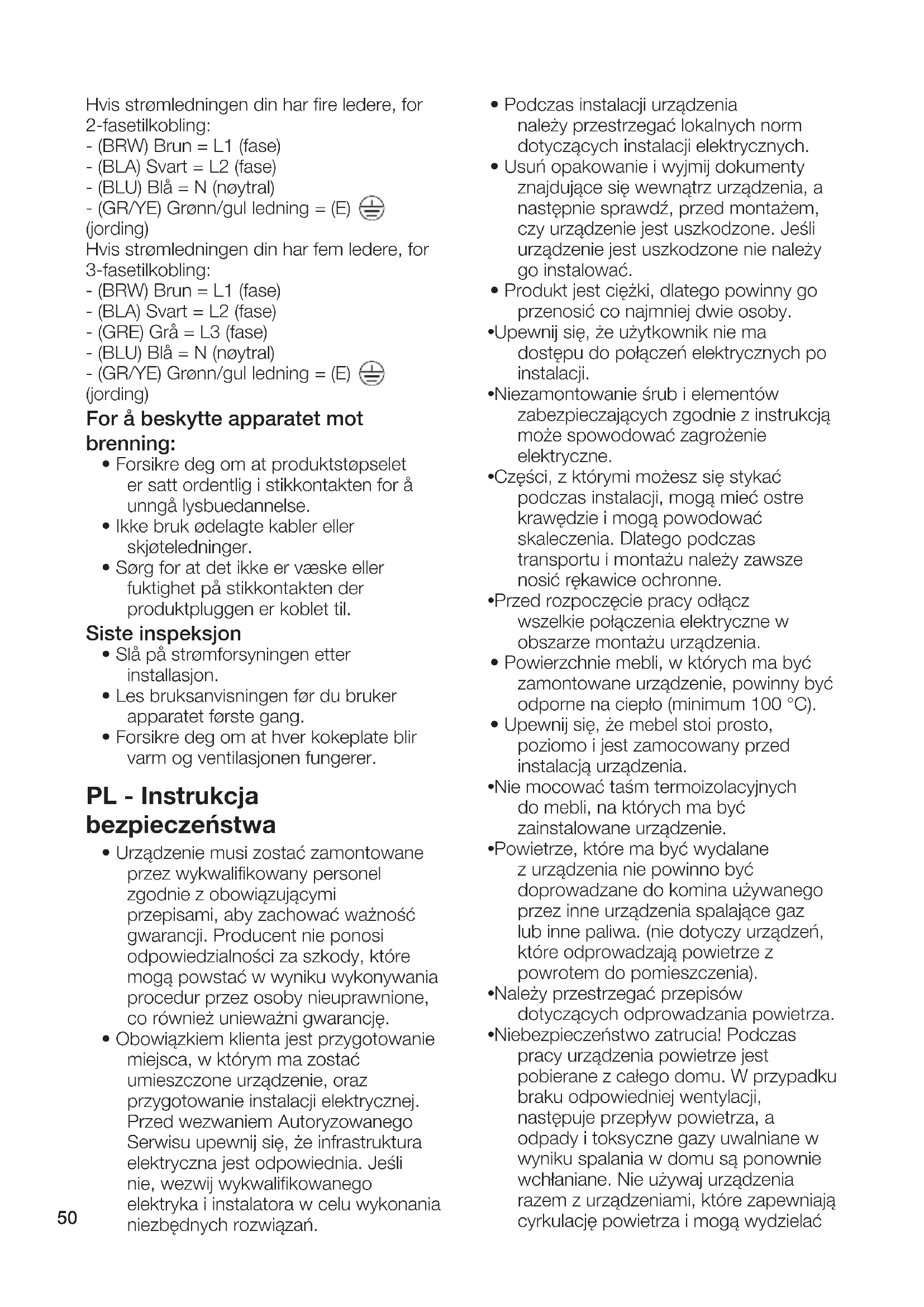 - Podłącz urządzenie do sieci elektrycznej zgodnie z poniższym opisem i typem przewodu. Typ przewodu urządzenia jest określony w rozdziale „Dane techniczne” instrukcji obsługi. Jeśli typ przewodu jest 3-żyłowy, podłącz urządzenie do sieci 1-fazowej: - (BRW) Brązowy = L (Faza) - (BLU) Niebieski = N (Neutralny) - (GR/YE) Zielony/żółty przewód = (E) (Uziemienie) Jeśli typ przewodu jest 5-żyłowy, podłącz urządzenie do sieci 1-fazowej: Dla połączenia 1-fazowego - (BRW/BLA) Brązowy/Czarny = L (Faza) - (BLU/GRE) Niebieski/Szary = N (Neutralny) - (GR/YE) Zielony/żółty przewód = (E) (Uziemienie)54 Jeśli typ przewodu jest 5-żyłowy, podłącz urządzenie do sieci 2-fazowej: - (BRW) Brązowy = L1 (Faza) - (BLA) Czarny = L2 (Faza) - (BLU/GRE) Niebieski/Szary = N (Neutralny) - (GR/YE) Zielony/żółty przewód = (E) (Uziemienie) Jeśli typ przewodu jest 4-żyłowy, podłącz urządzenie do sieci 2-fazowej: - (BRW) Brązowy = L1 (Faza) - (BLA) Czarny = L2 (Faza) - (BLU) Niebieski = N (Neutralny) - (GR/YE) Zielony/żółty przewód = (E) (Uziemienie) Jeśli typ przewodu jest 5-żyłowy, podłącz urządzenie do sieci 3-fazowej: - (BRW) Brązowy = L1 (Faza) - (BLA) Czarny = L2 (Faza) - (GRE) Szary = L3 (Faza) - (BLU) Niebieski = N (Neutralny) - (GR/YE) Zielony/żółty przewód = (E) (Uziemienie) W celu ochrony urządzenia przed oparzeniem: