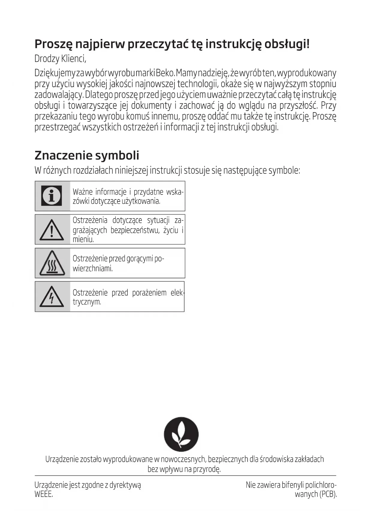 - Plaats geen zware lasten op het apparaat of op de verpakking. Het apparaat kan worden be- schadigd.Proszę najpierw przeczytać tę instrukcję obsługi! Drodzy Klenc, Dzękujemy za wybór wyrobu mark Beko. Mamy nadzeję, że wyrób ten, wyprodukowany przy użycu wysokej jakośc najnowszej technolog, okaże sę w najwyższym stopnu zadowalający. Dlatego proszę przed jego użycem uważne przeczytać całą tę nstrukcję obsług towarzyszące jej dokumenty zachować ją do wglądu na przyszłość. Przy przekazanu tego wyrobu komuś nnemu, proszę oddać mu także tę nstrukcję. Proszę przestrzegać wszystkch ostrzeżeń nformacj z tej nstrukcj obsług. Znaczenie symboli W różnych rozdzałach nnejszej nstrukcj stosuje sę następujące symbole: