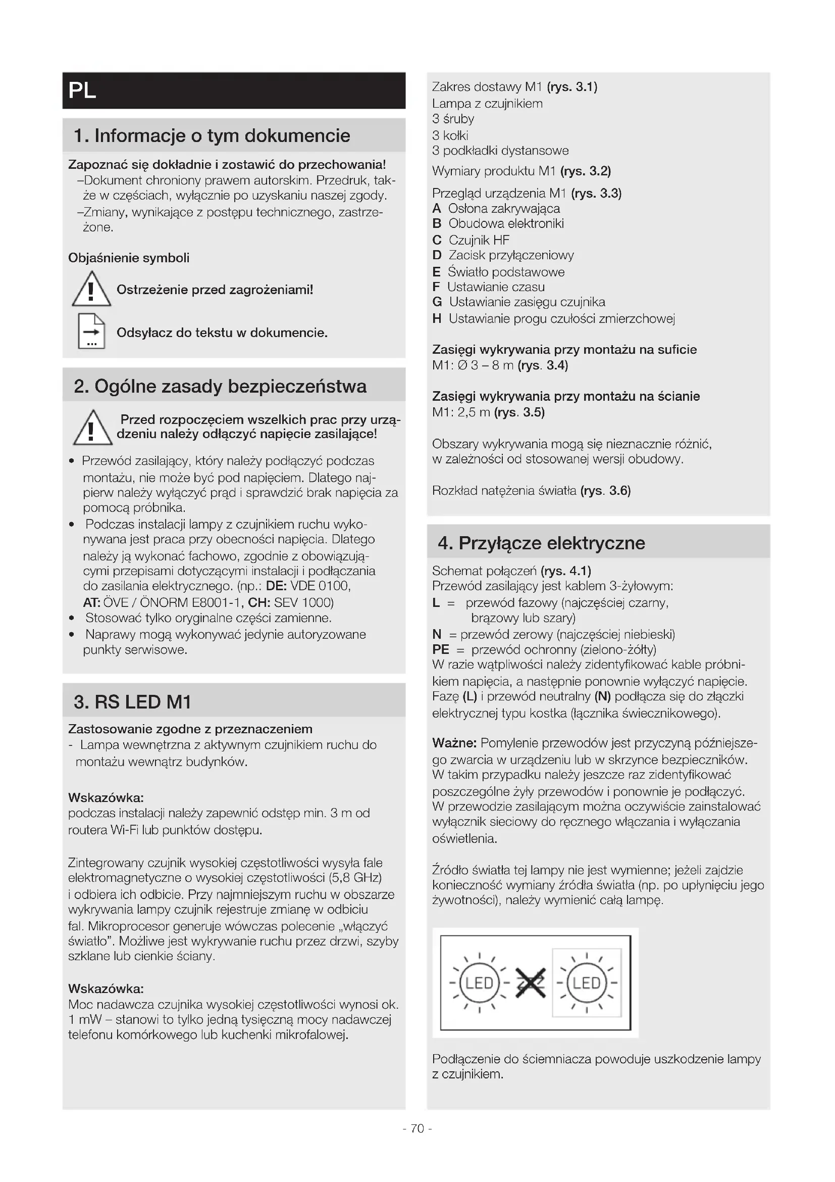 SK- 70 - Zakres dostawy M1 (rys.3.1) Lampa z czujnikiem 3 śruby 3 kołki 3 podkładki dystansowe Wymiary produktu M1 (rys.3.2) Przegląd urządzenia M1 (rys.3.3) A Osłona zakrywająca B Obudowa elektroniki C Czujnik HF D Zacisk przyłączeniowy E Światło podstawowe F Ustawianie czasu G Ustawianie zasięgu czujnika H Ustawianie progu czułości zmierzchowej Zasięgi wykrywania przy montażu na suficie M1: Ø 3 – 8 m (rys.3.4) Zasięgi wykrywania przy montażu na ścianie M1: 2,5 m (rys.3.5) Obszary wykrywania mogą się nieznacznie różnić, w zależności od stosowanej wersji obudowy. Rozkład natężenia światła (rys.3.6)